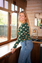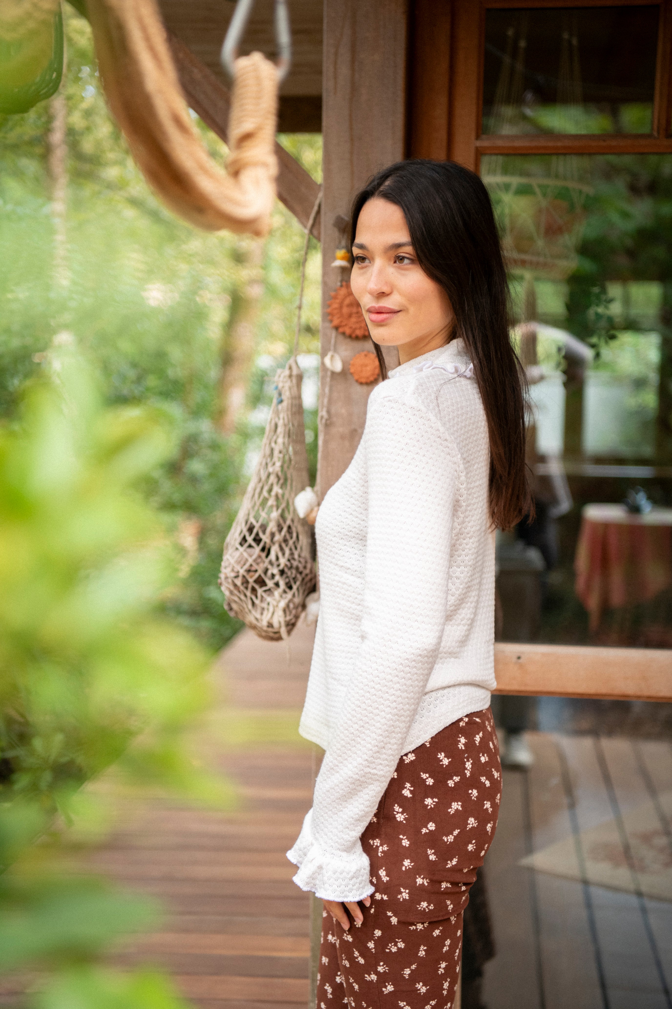 Clara (version sous-pull fleuri) porte une taille 44 et mesure 1m75.