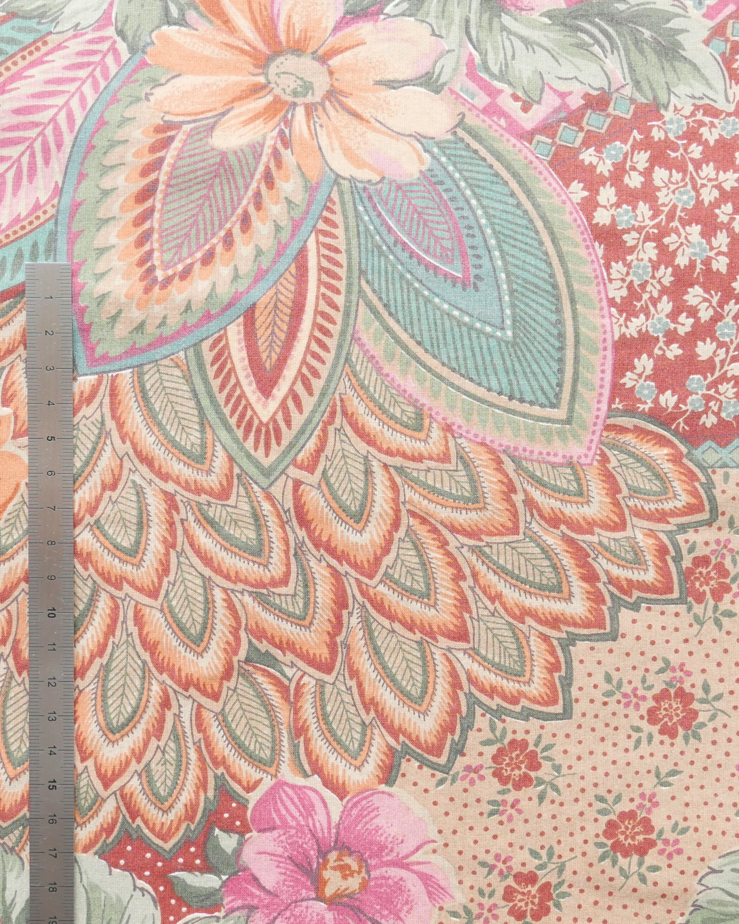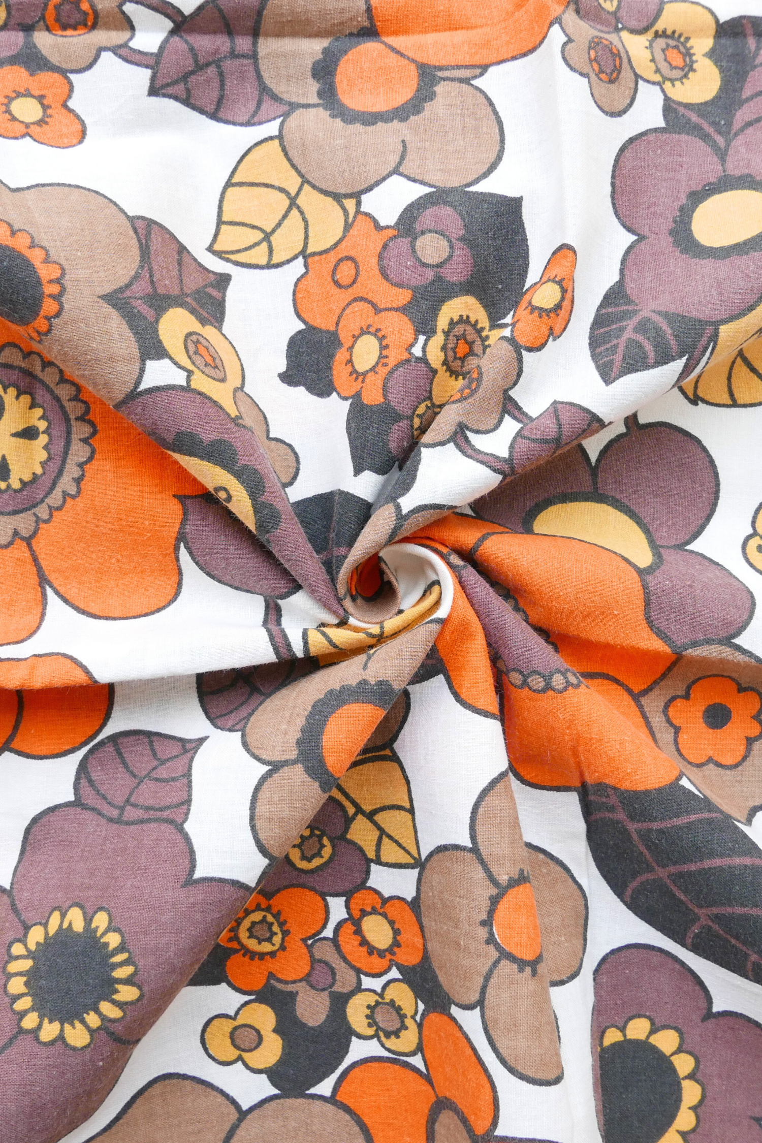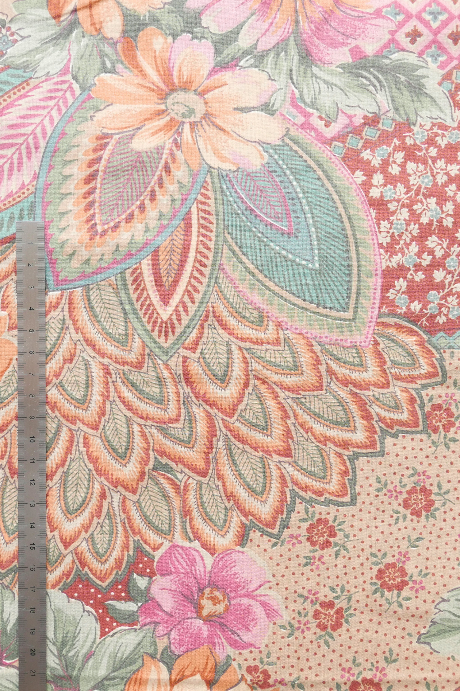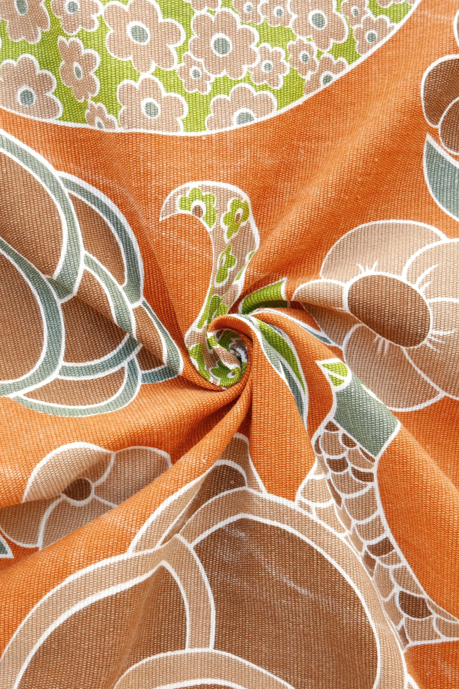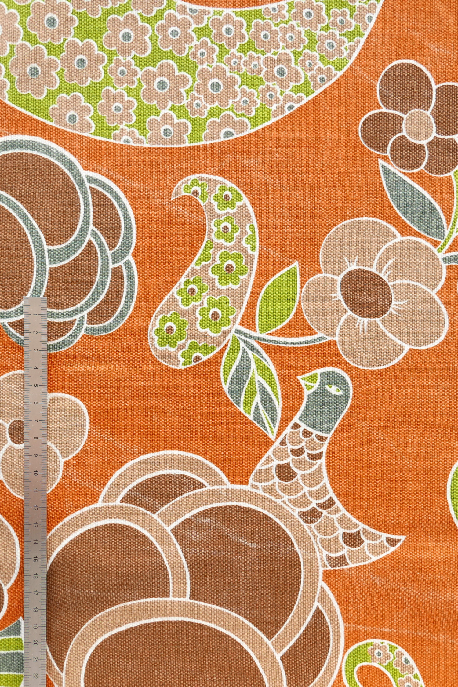 Tissu - Coton - Fond orange avec desmotifs floraux marron et verts - 137 * 246 cm