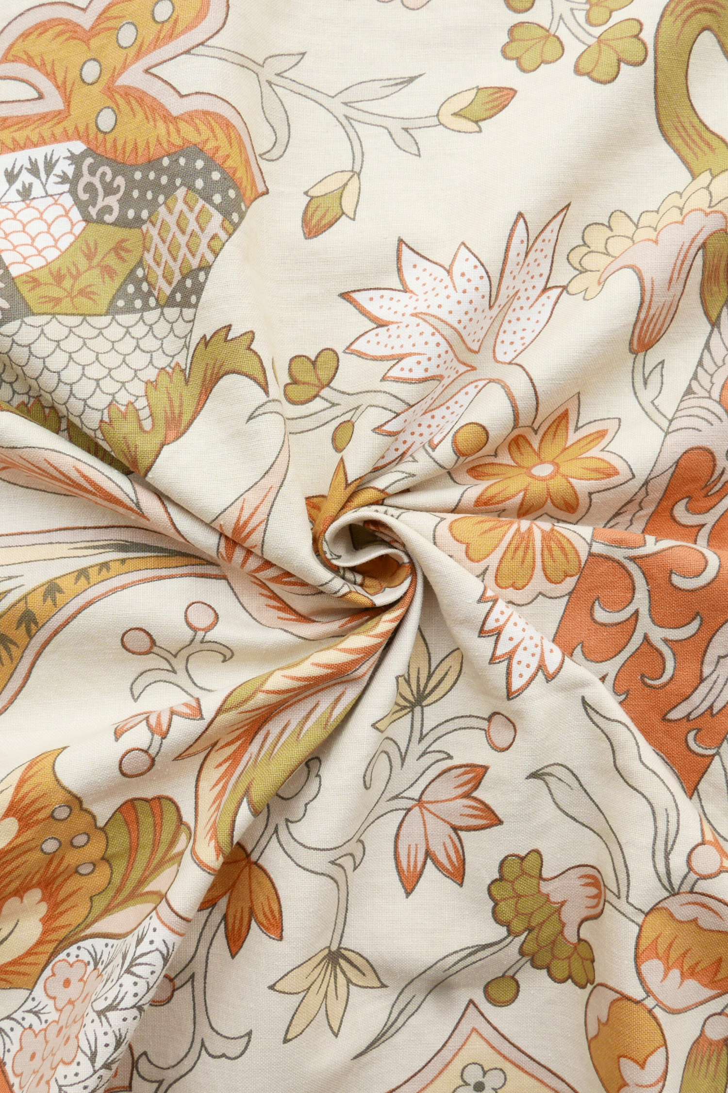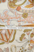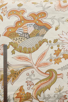 Fond écru avec divers motifs aux teintes beiges, orangées et jaunes.