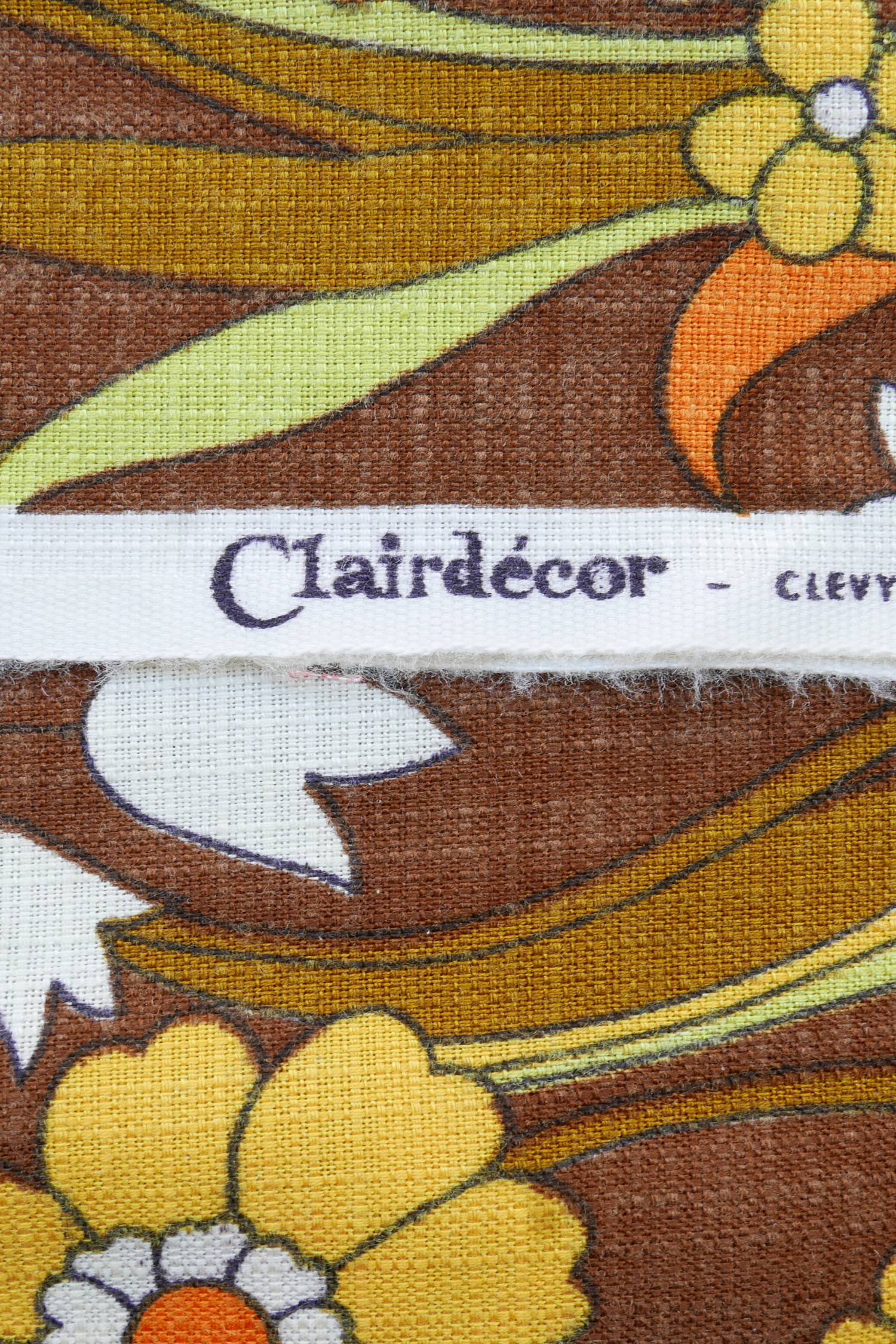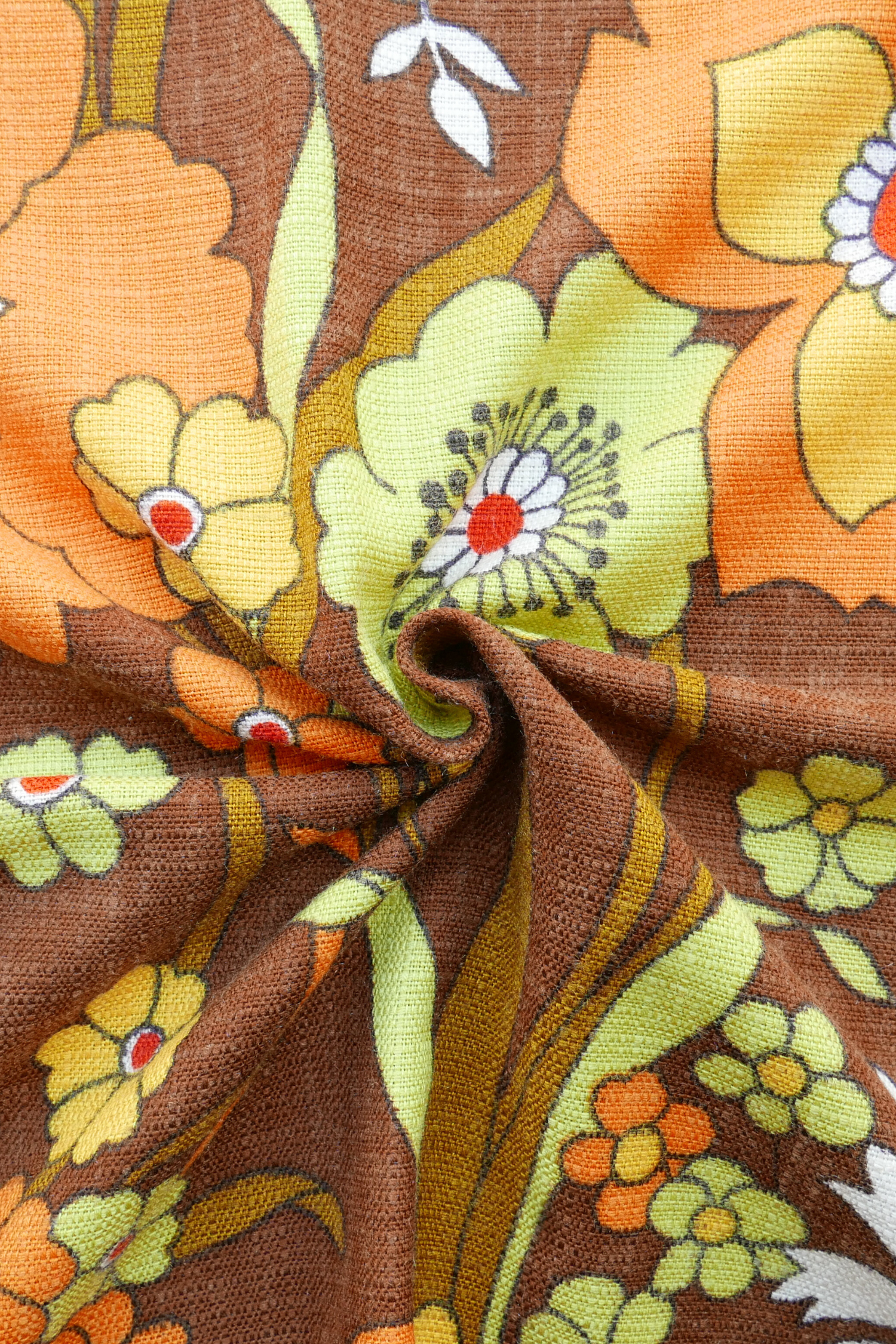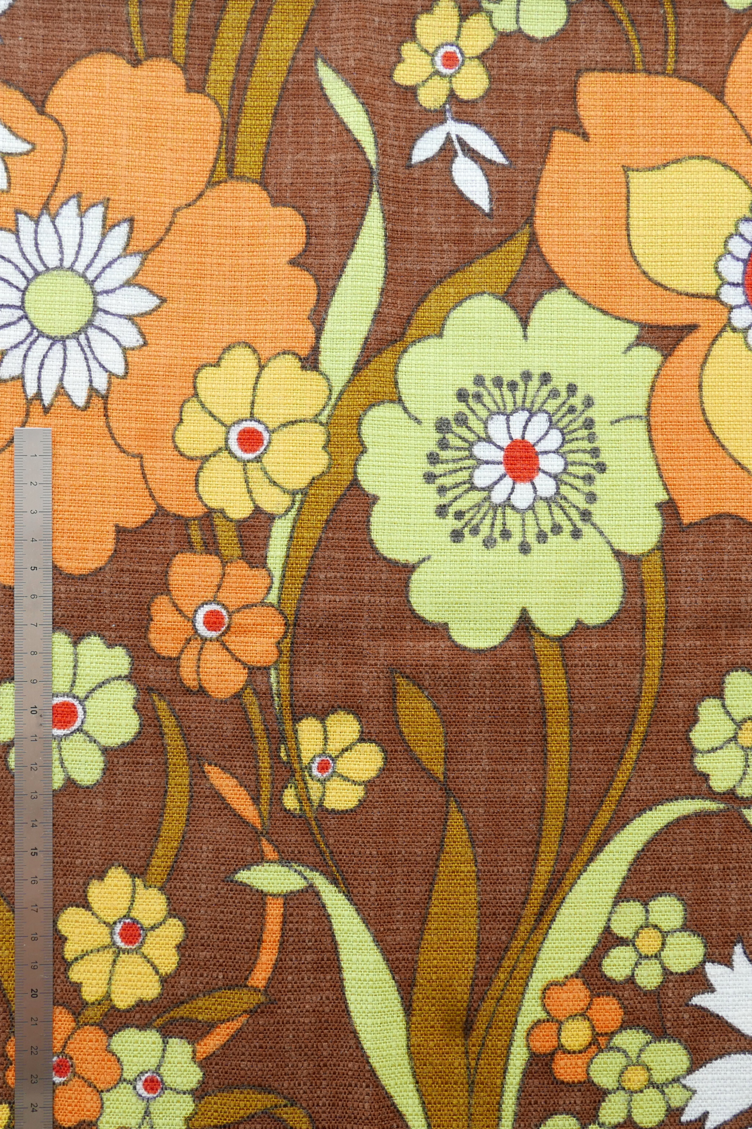 Tissu - Coton - Fond marron avec des fleurs jaunes, oranges et blanches - 147 * 240 cm