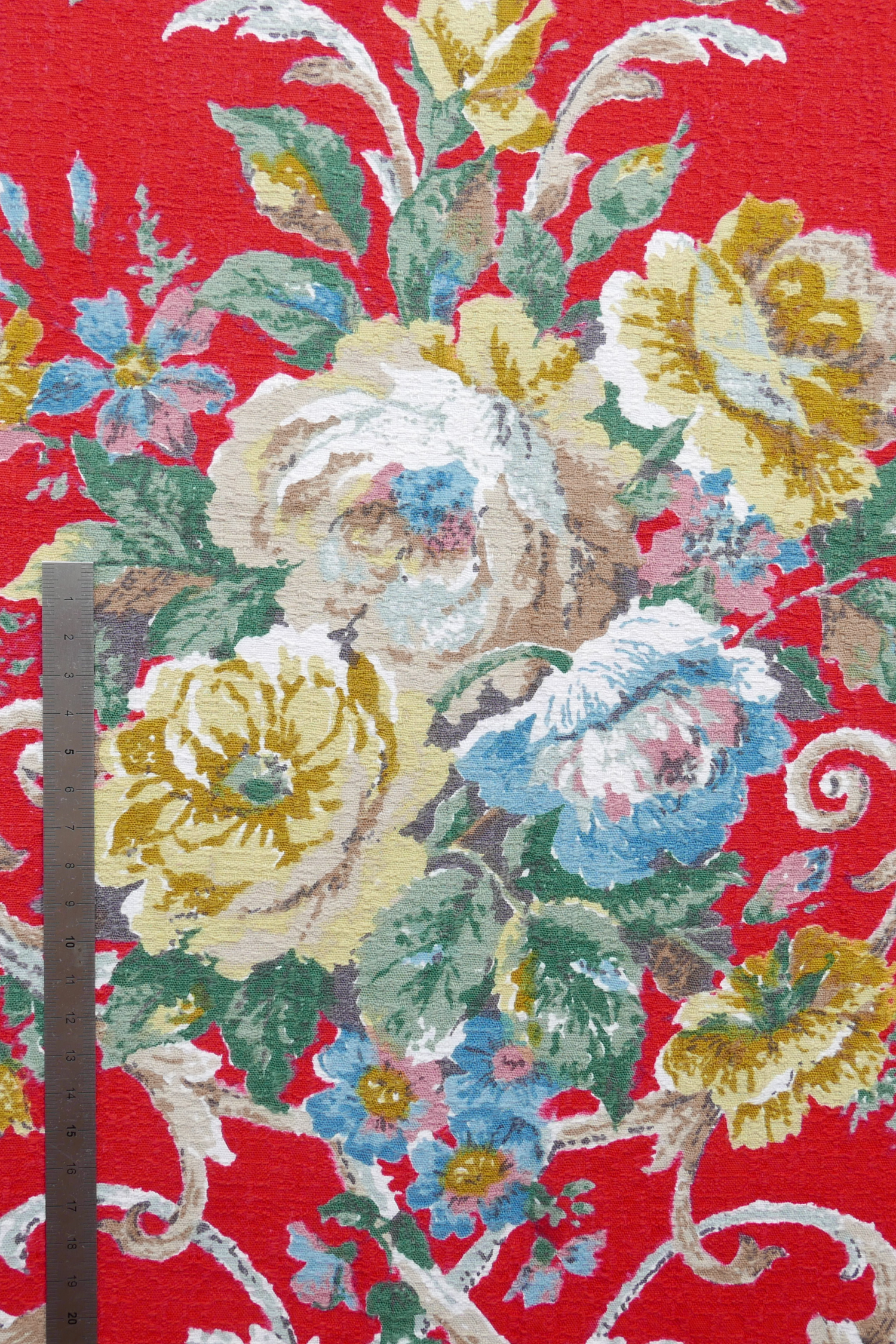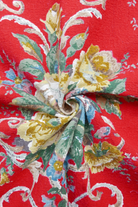 Tissu - Coton - Fond rouge avec des fleurs aux teintes bleues, vertes et jaunes - 156 * 59 cm