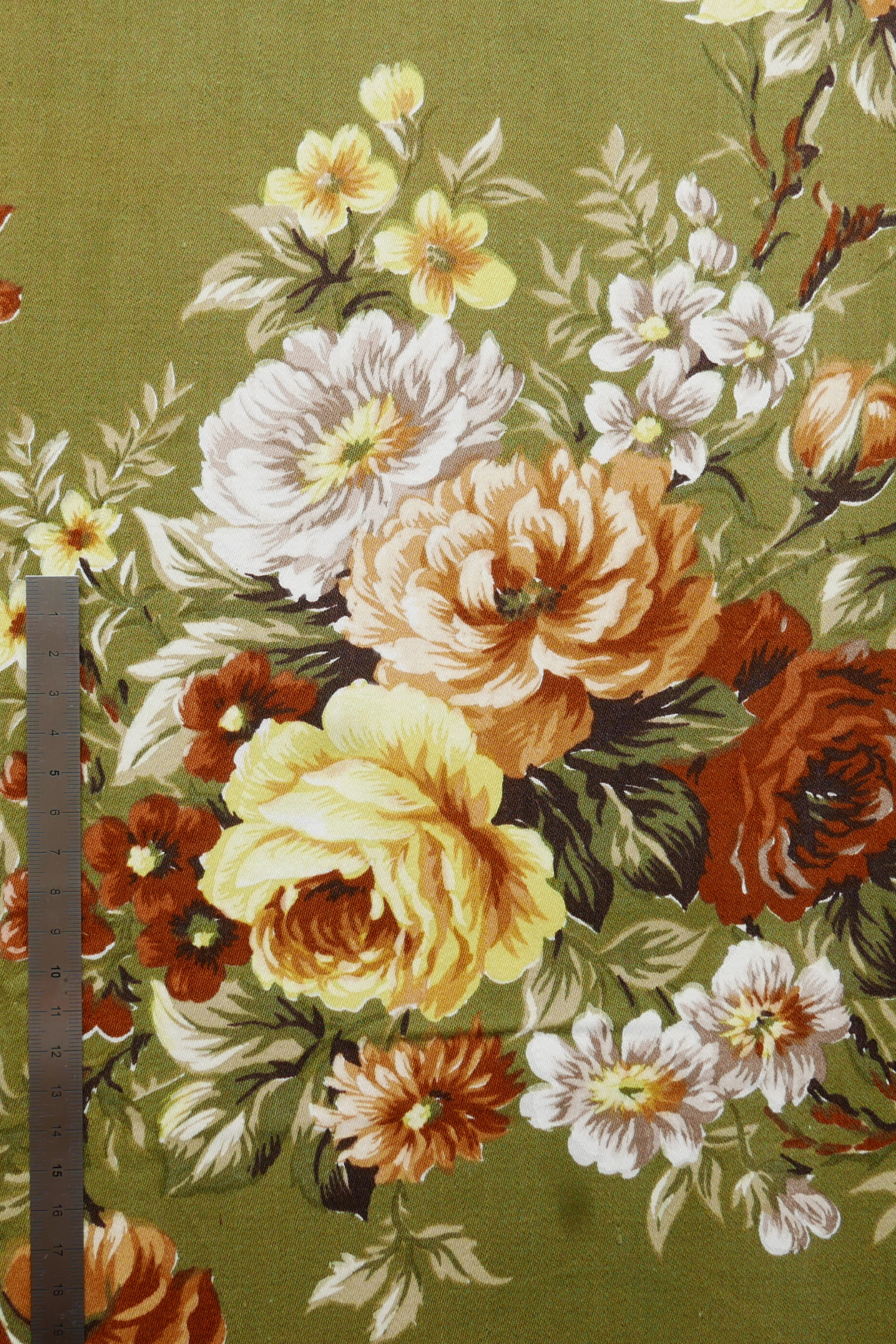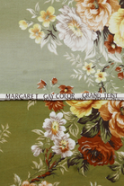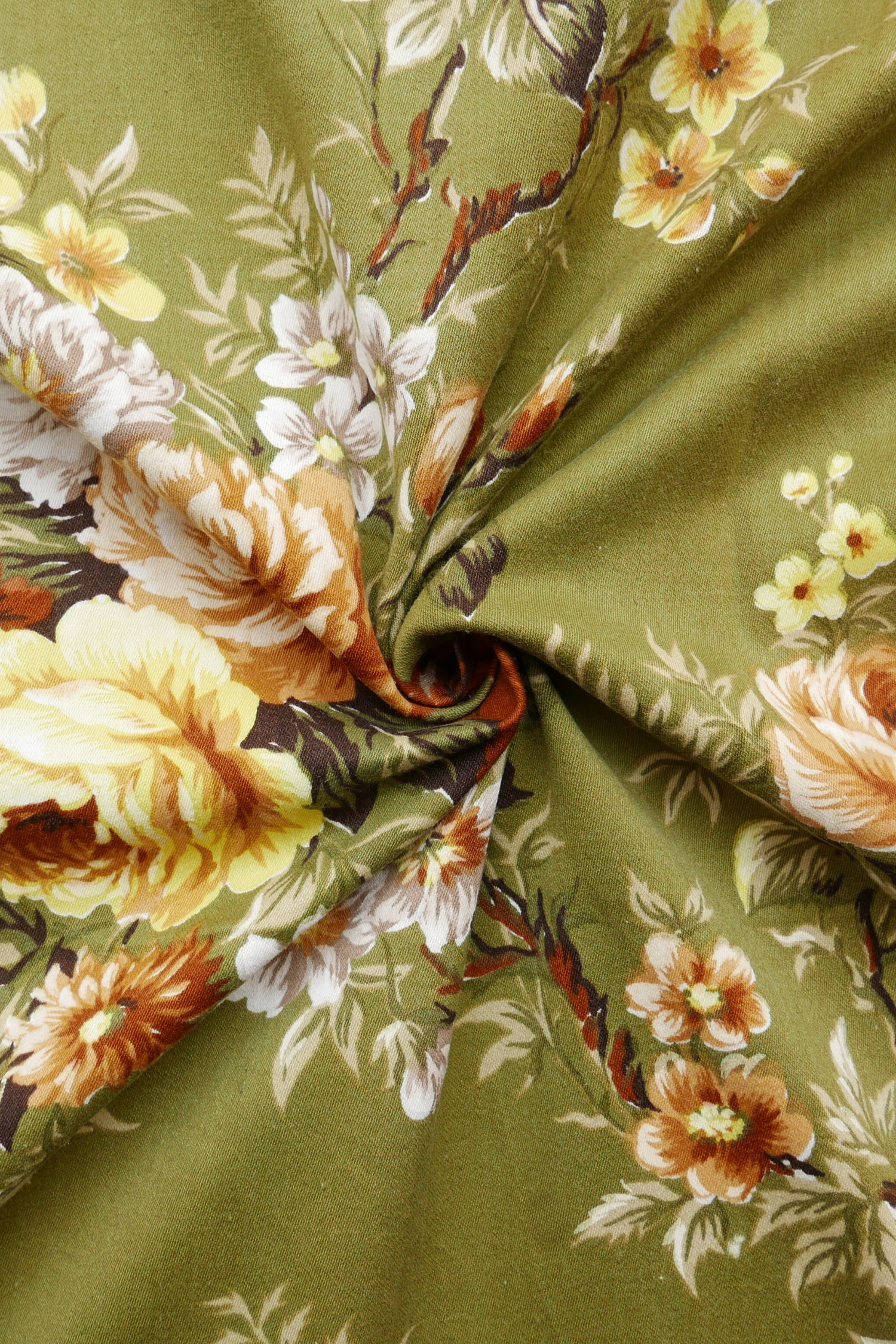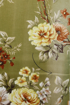 Tissu - Coton - Fond vert avec des fleurs jaunes, blanches et marron - 130 * 160 cm