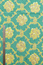 Tissu - Coton - Fond vert avec des fleurs jaunes Inscription : "Tout coton édité par Marignan pour Florine" - 117 * 148 cm