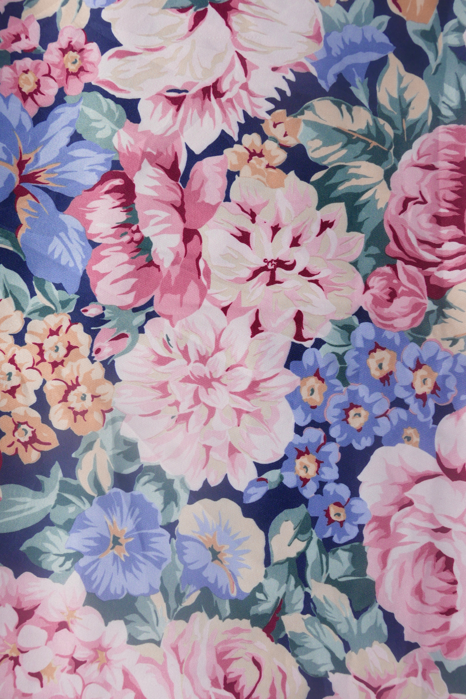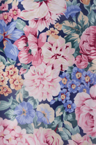 Effet satiné - Fond bleu avec des fleurs roses, bleues et jaunes.