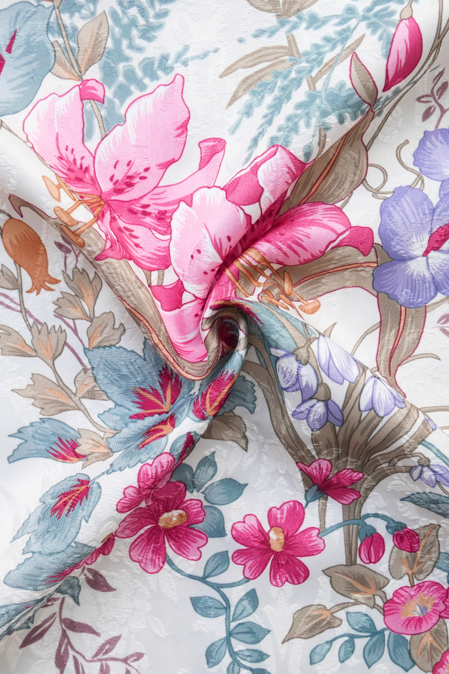 Tissu - Polyester - Fond blanc irisé avec des fleurs aux teintes roses - 145 cm * 241 cm