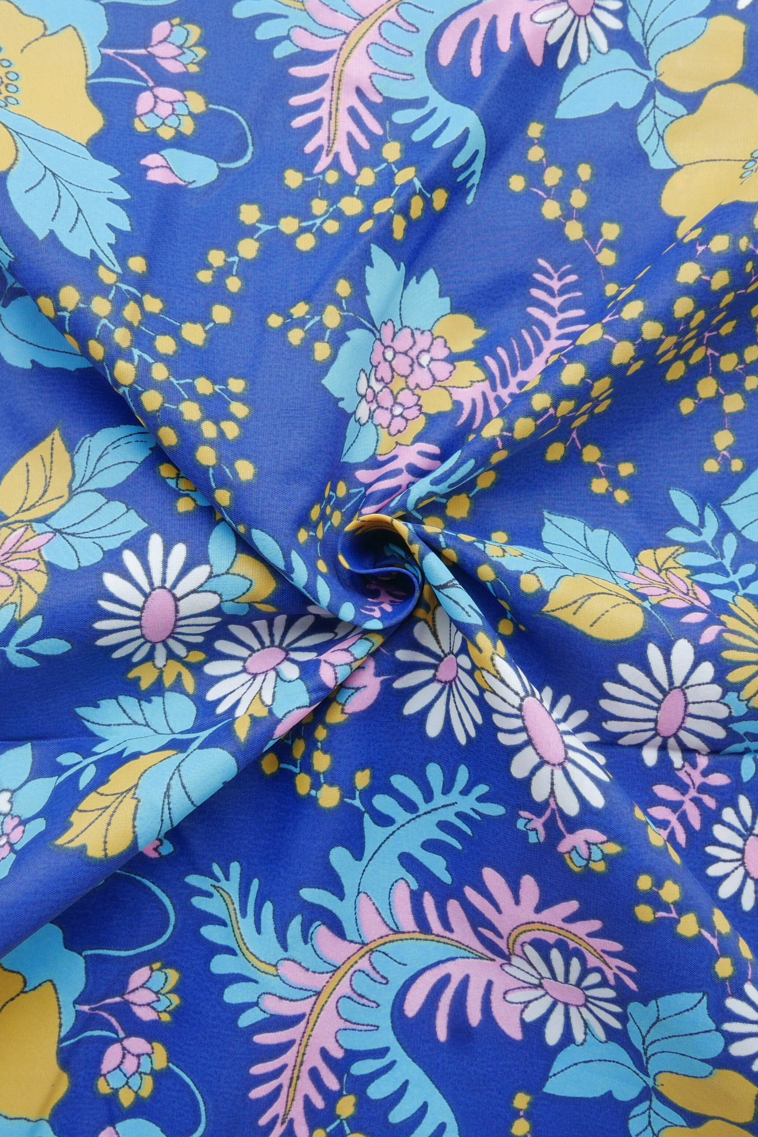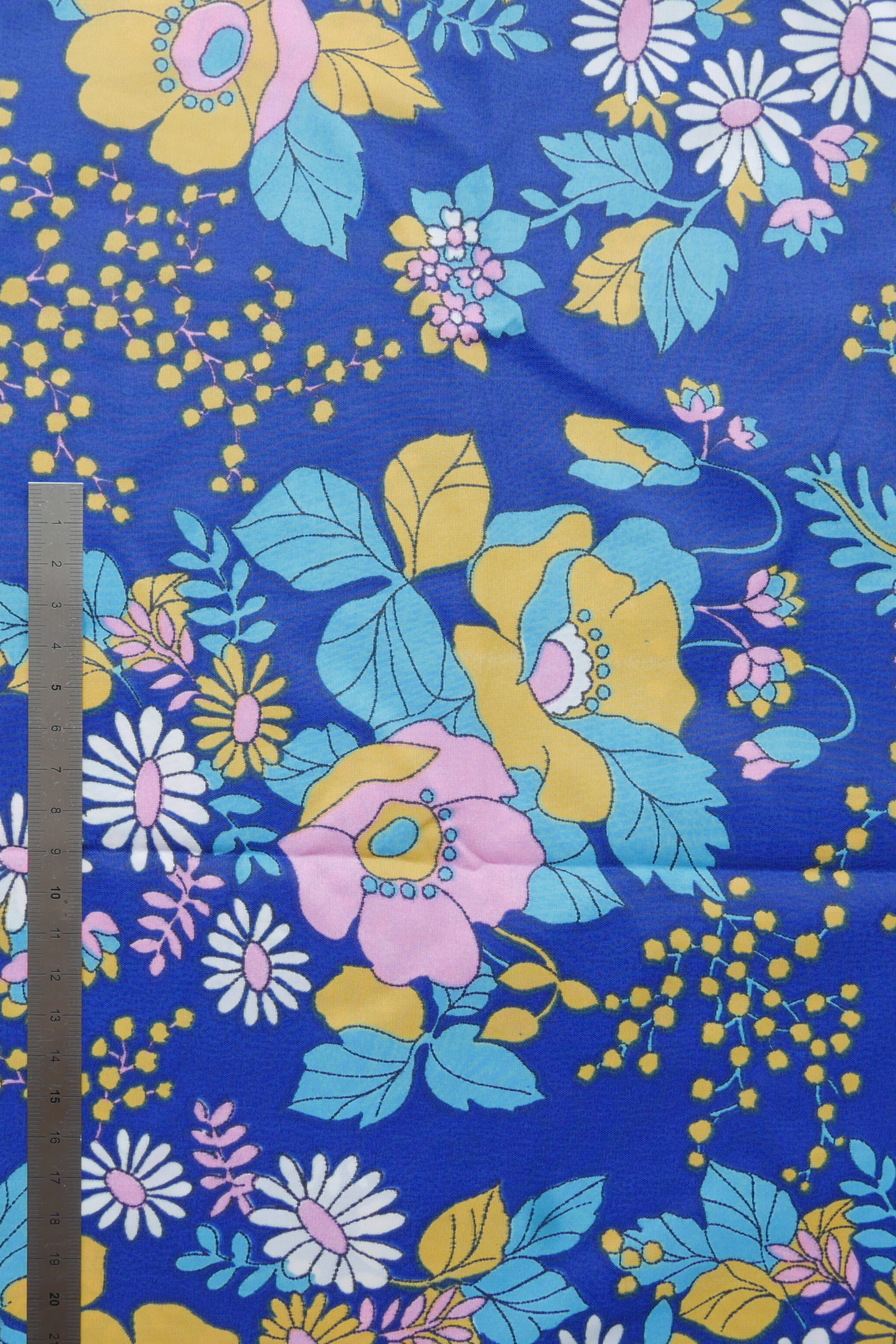 Tissu - Polyester - Fond bleu avec des fleurs bleues, roses, blanches et jaunes - 150 * 252 cm