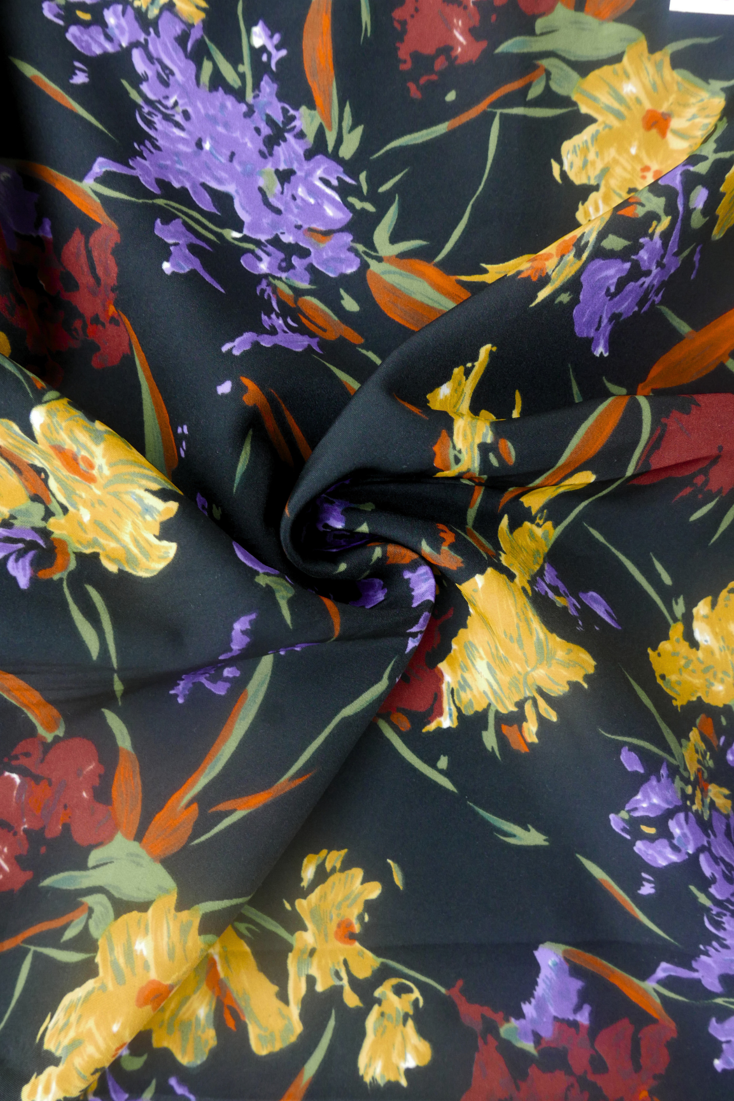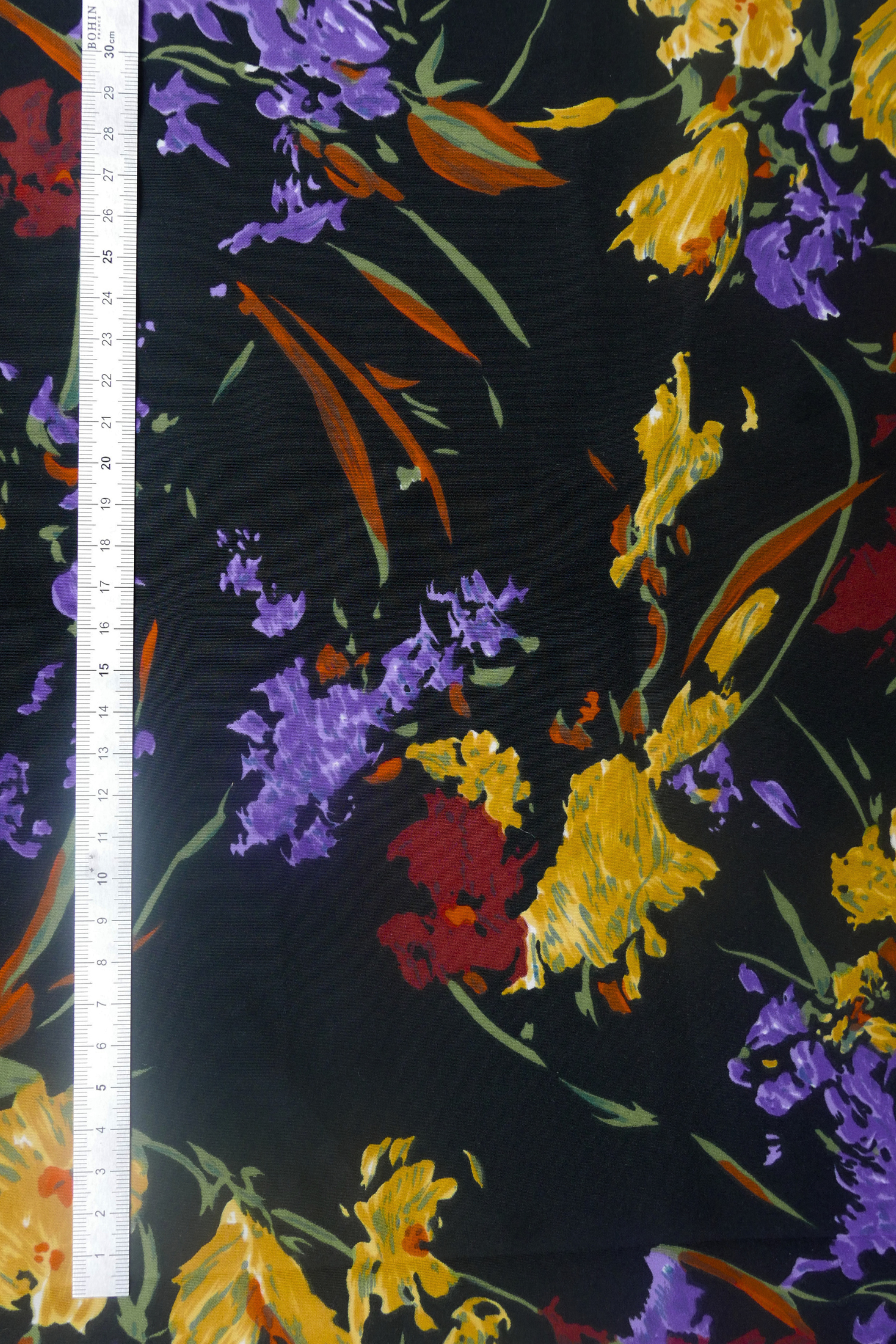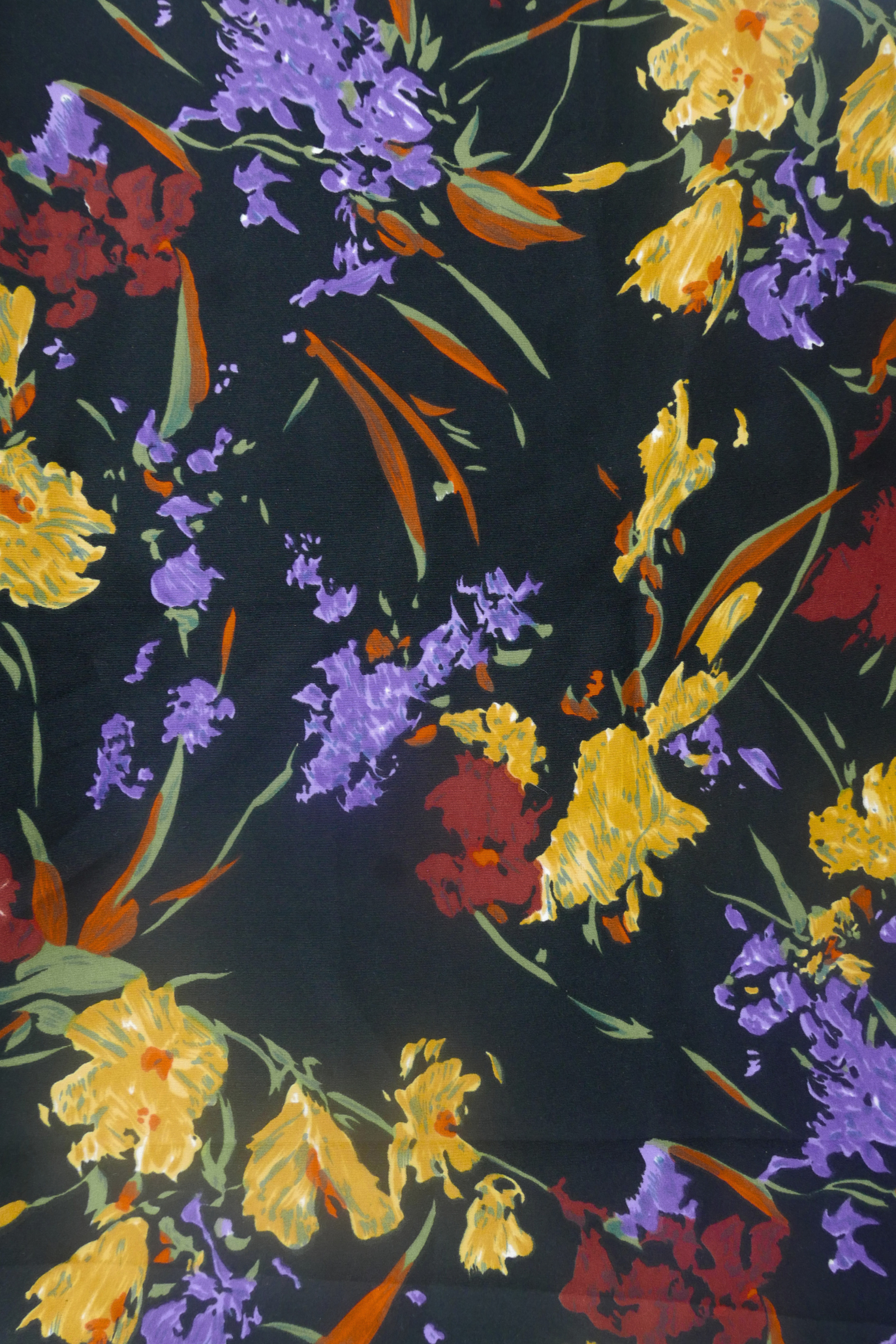 Fond noir avec des fleurs aux teintes rouges, jaunes et mauves ainsi que des pointes de vert.