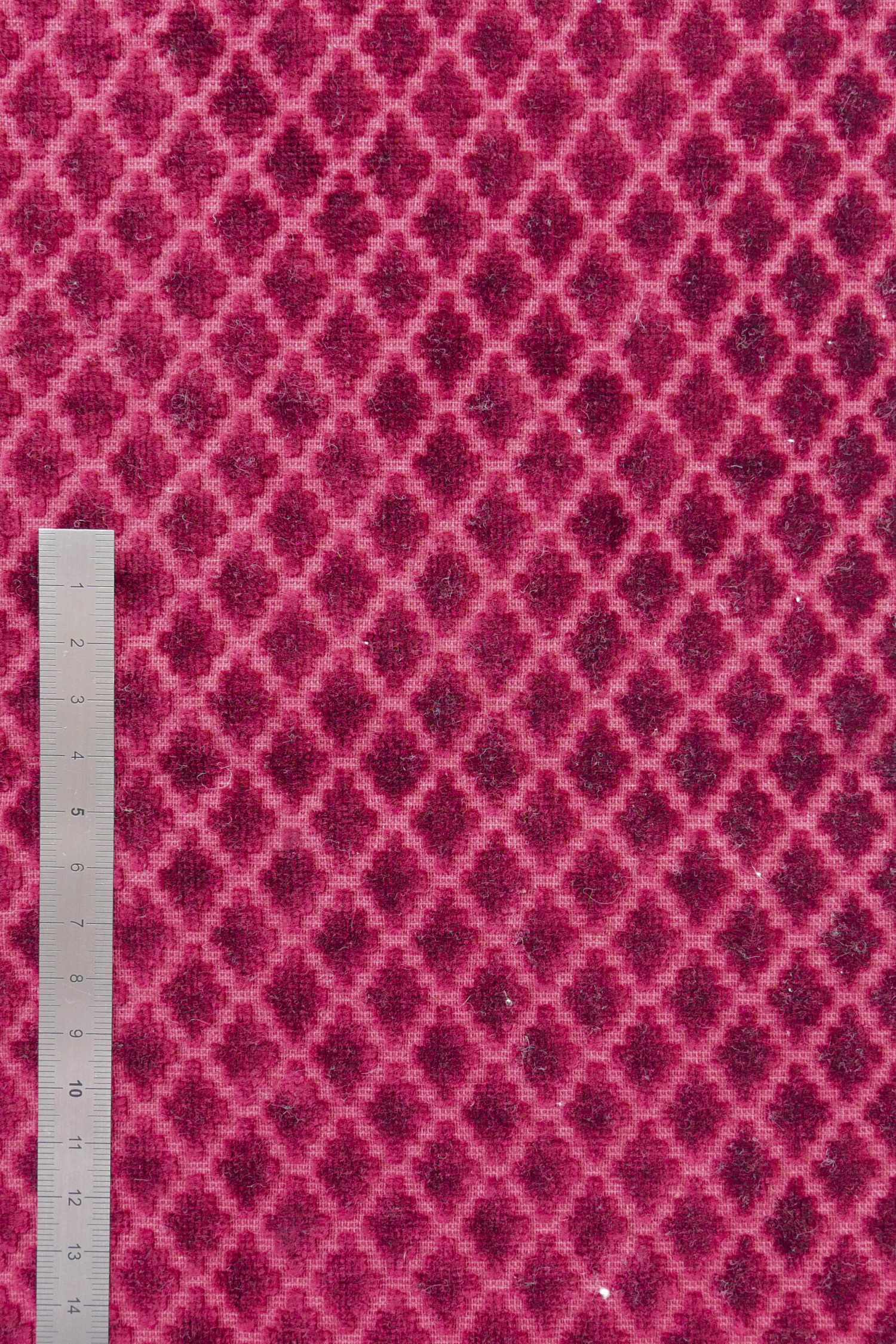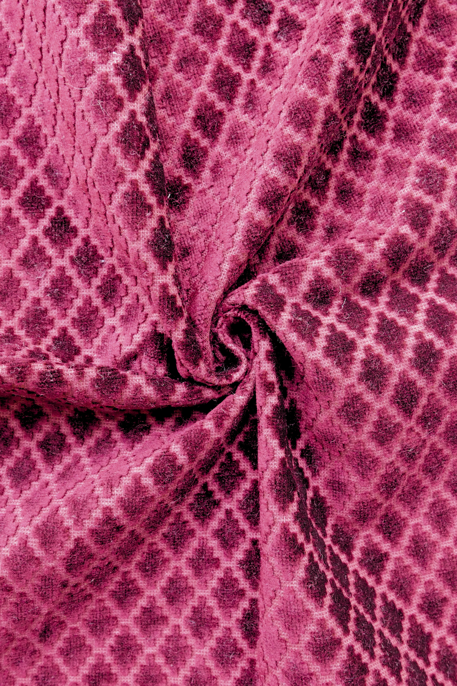 Rouge bordeaux avec de petits motifs réguliers en velours.