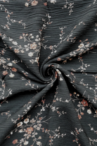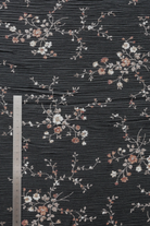 Tissu plissé - Fond noir avec des fleurs jaunes et rouges.