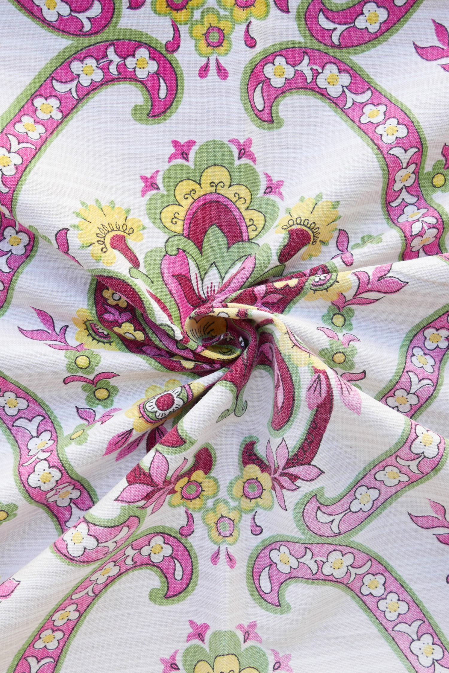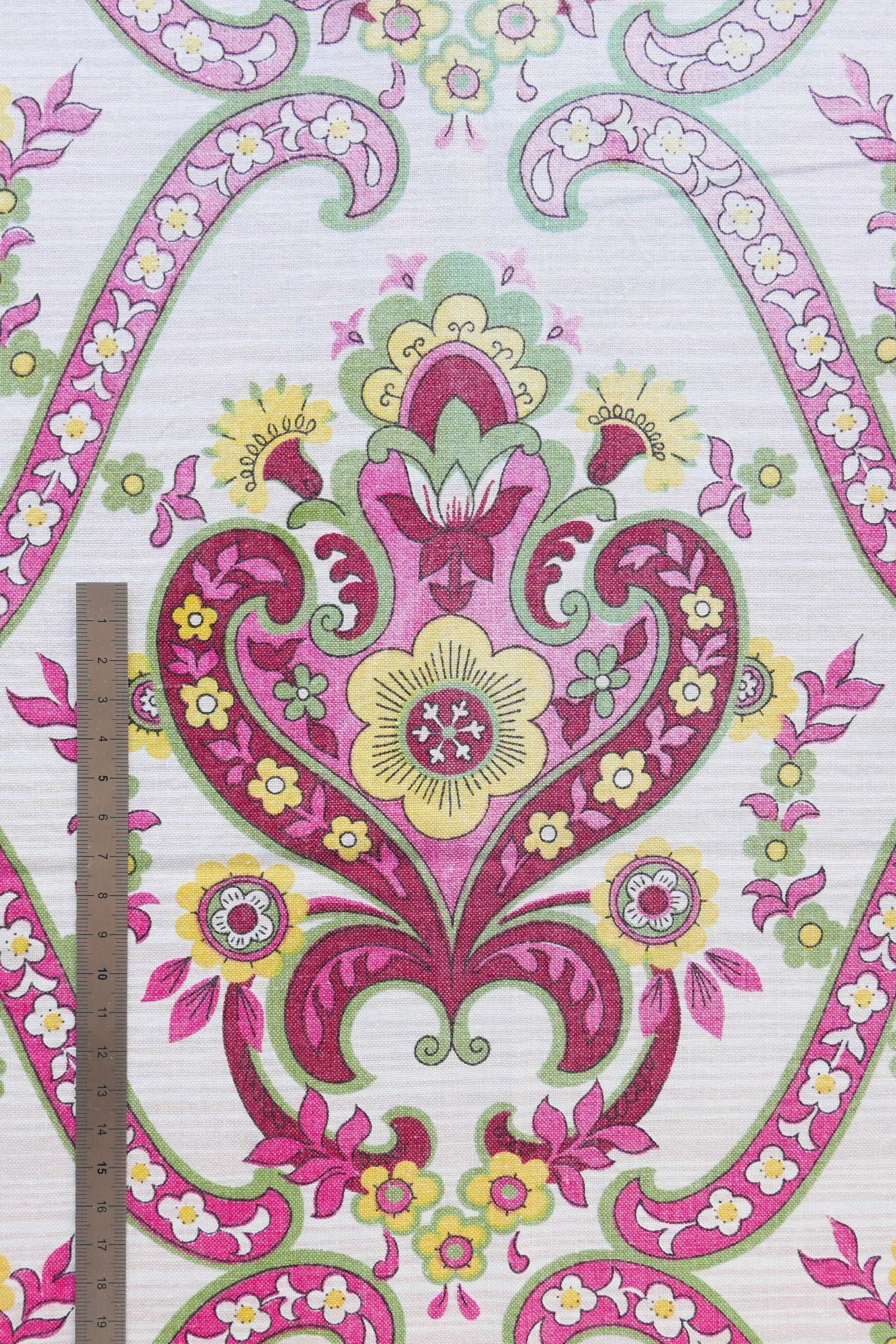 Tissu - Coton - Fond beige et blanc avec des fleurs jaunes, roses et vertes - 95 * 118 cm