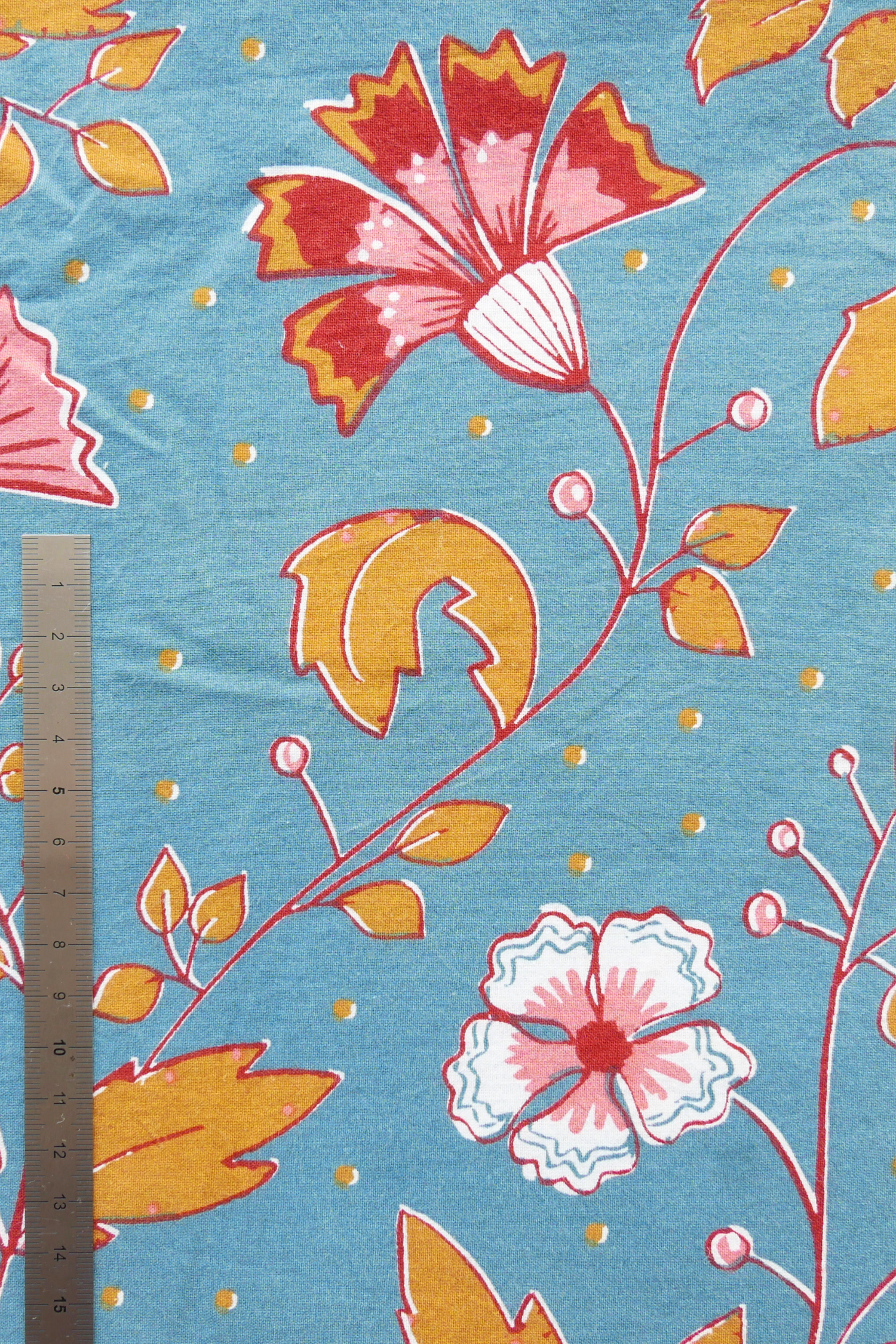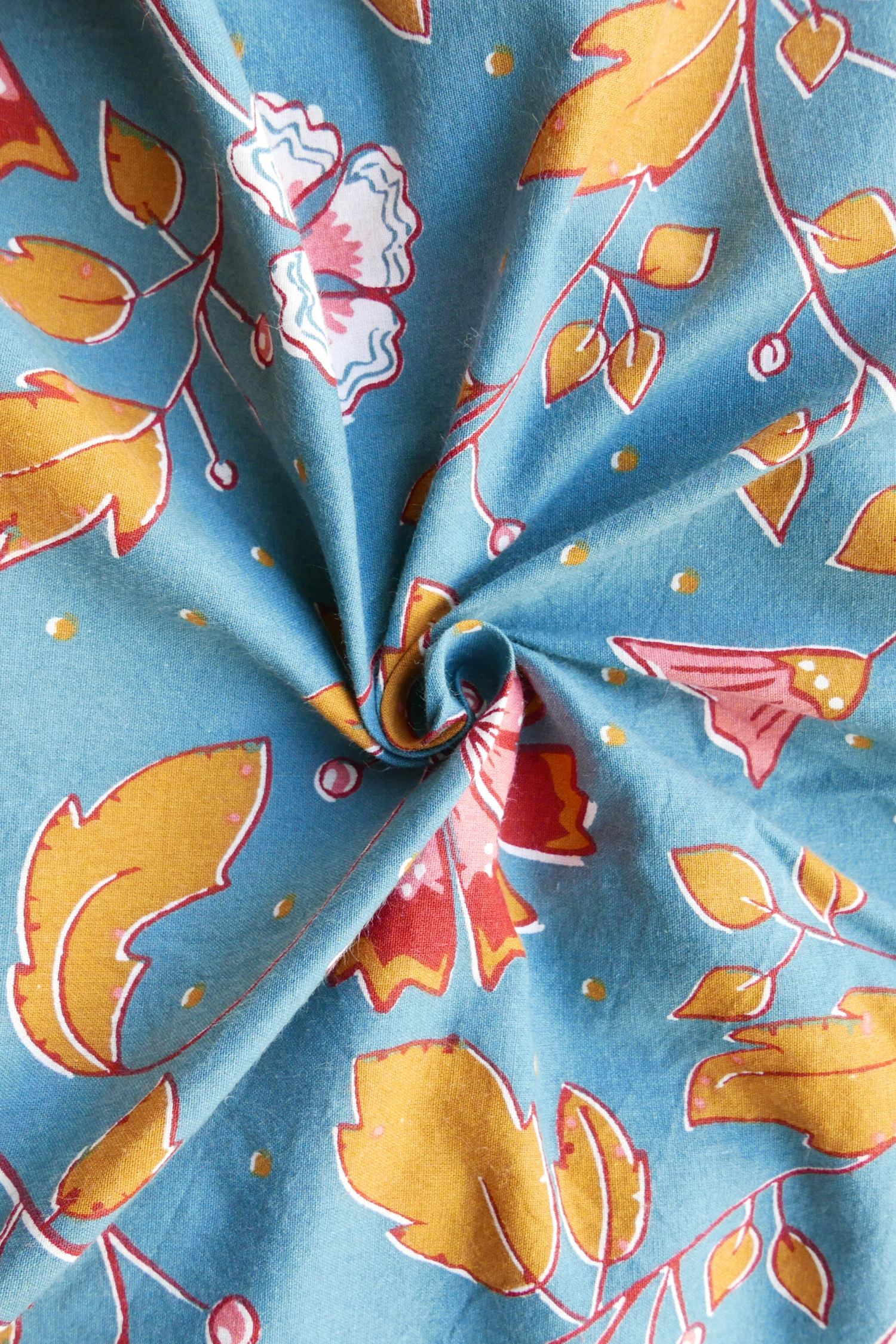 Tissu - Coton - Fond bleu avec des fleurs aux teintes rouges et marron - 215 cm * 228 cm