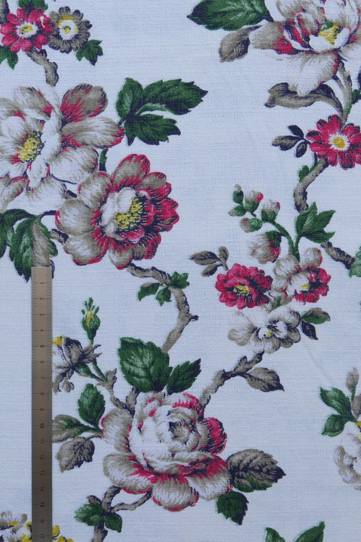 Tissu - Polyester - Fond blanc avec des fleurs aux teintes jaunes, roses et taupe - 42 * 256 cm