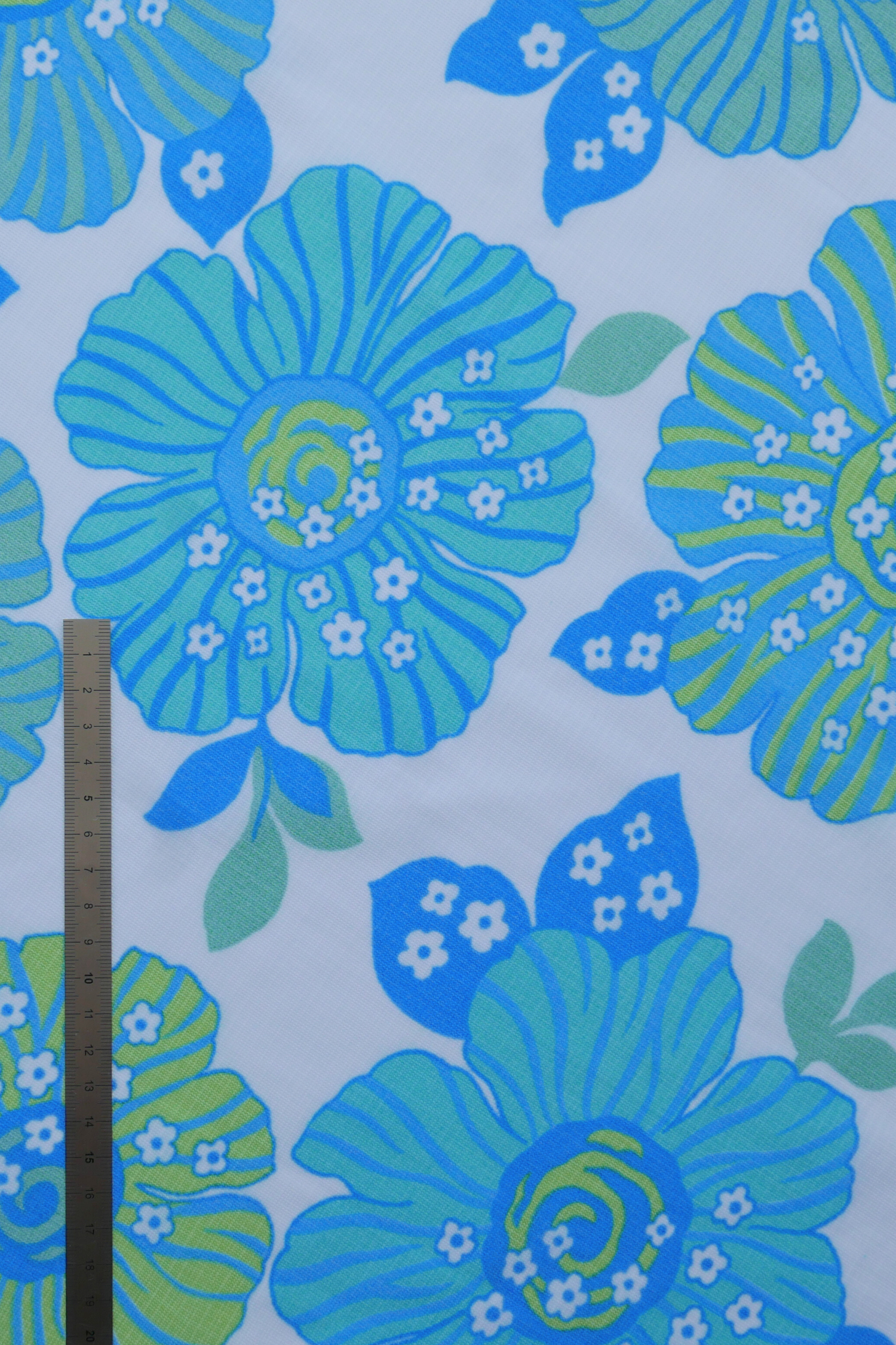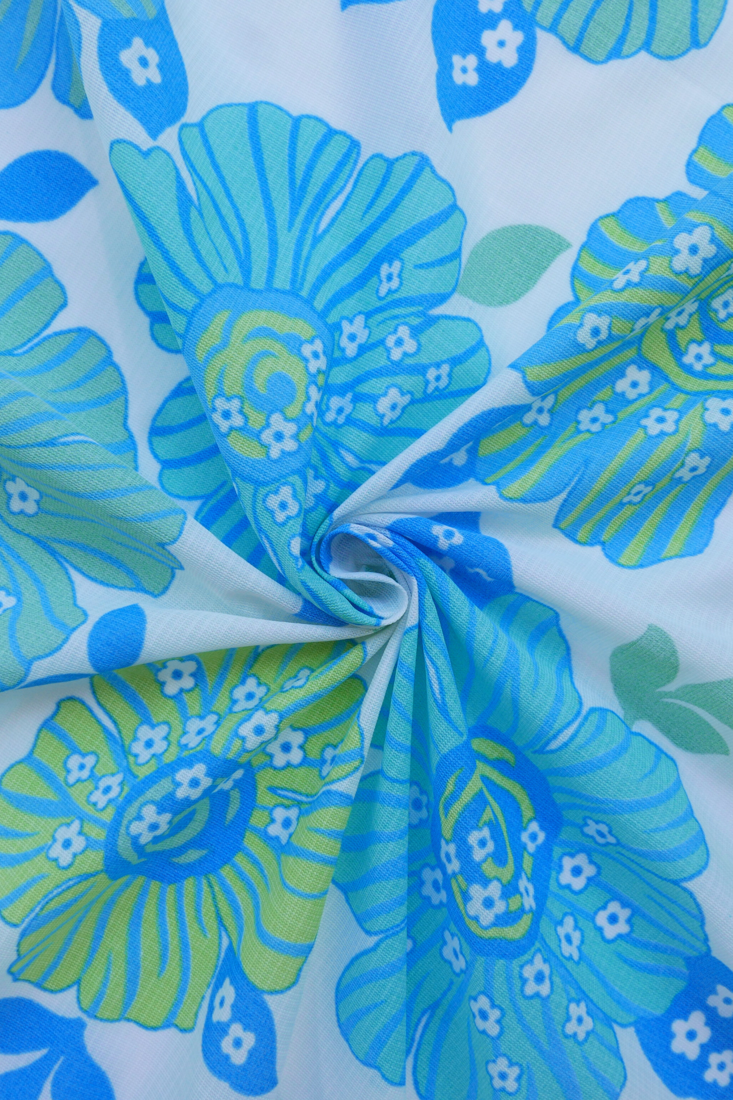 Tissu - Polyester - Voile - Fond blanc avec des fleurs vertes et bleues - Diamètre 177 cm