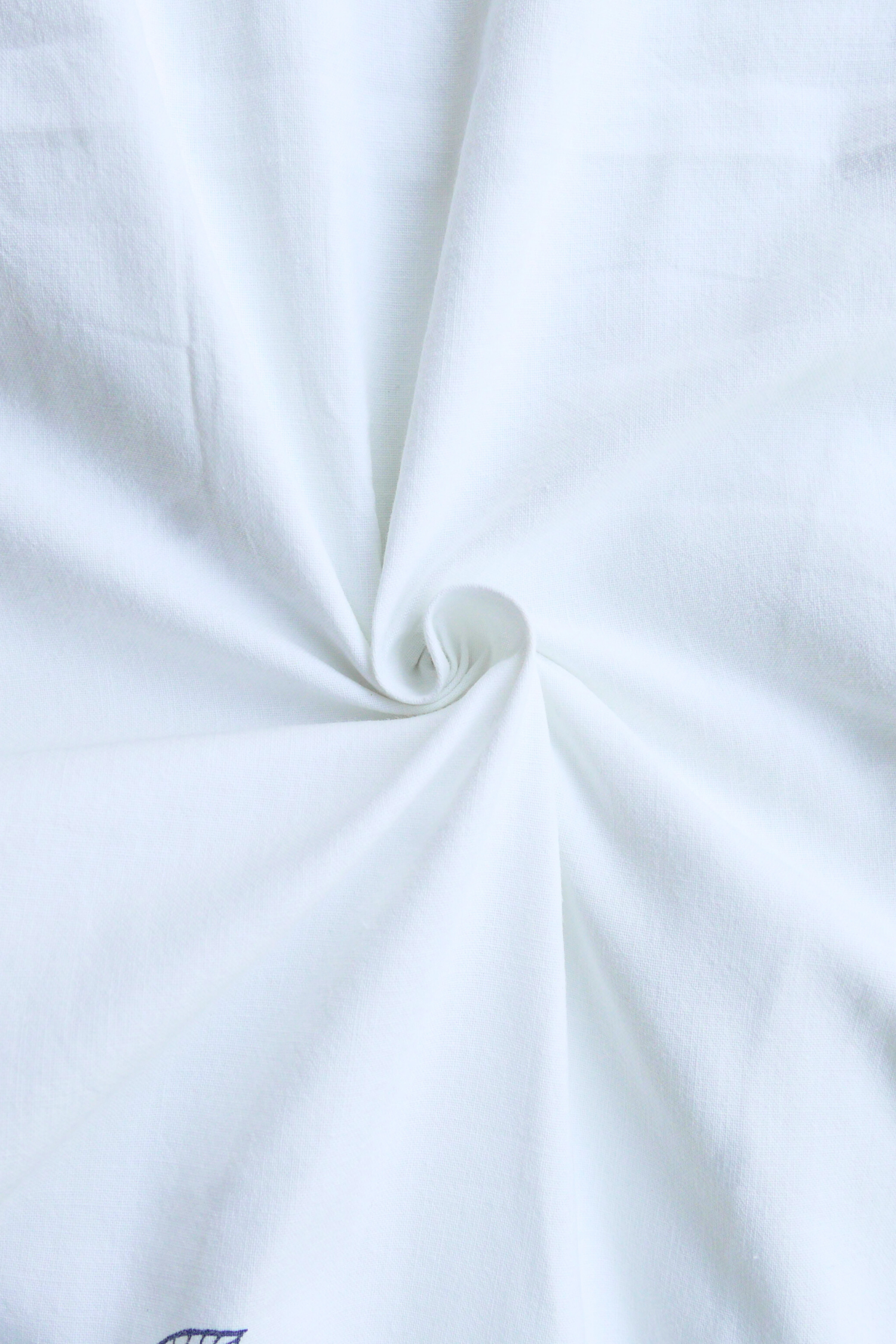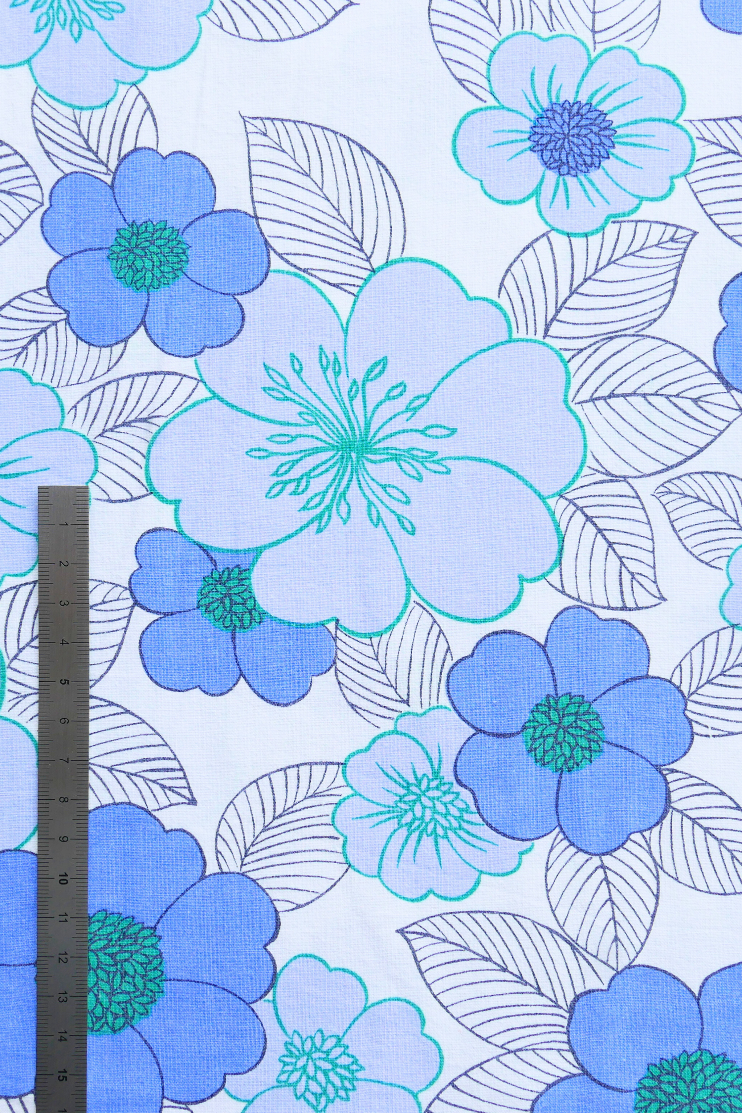 Tissu - Coton - Fond blanc avec des fleurs aux teintes bleues et des touches de vert L'imprimé se trouve à une extrémité du tissu - 278 cm * 232 cm