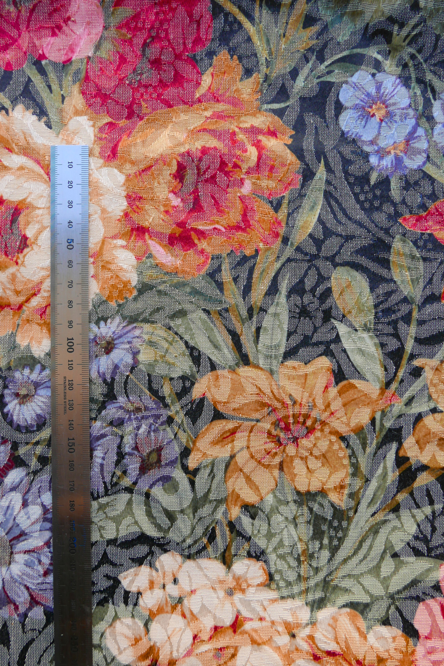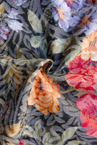 Tissu - Polyester - Fond noir texturé et irisé avec des fleurs colorées - 69 cm * 269 cm