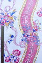 Fond blanc avec des bandes roses, orné de fleurs aux teintes roses et bleues.