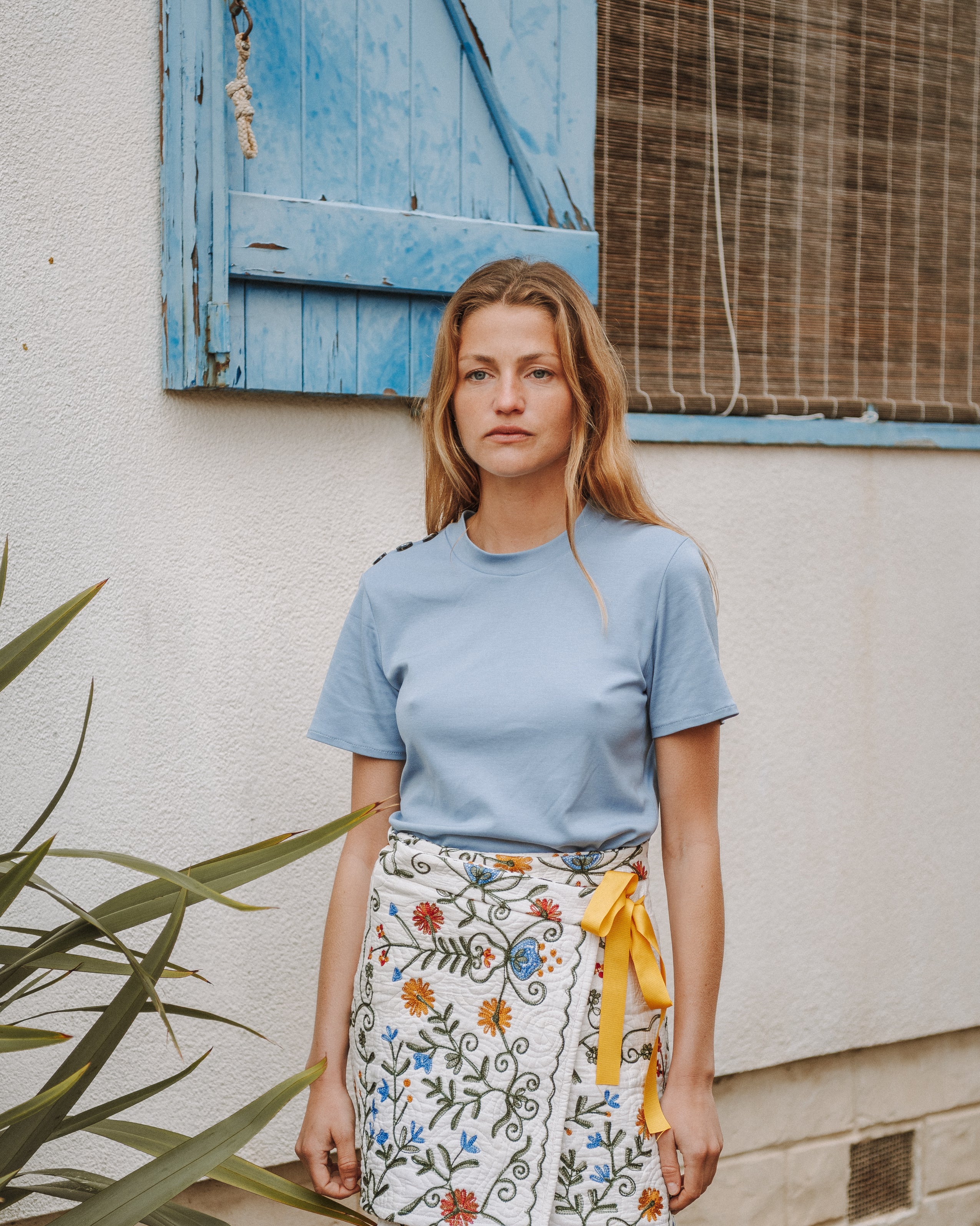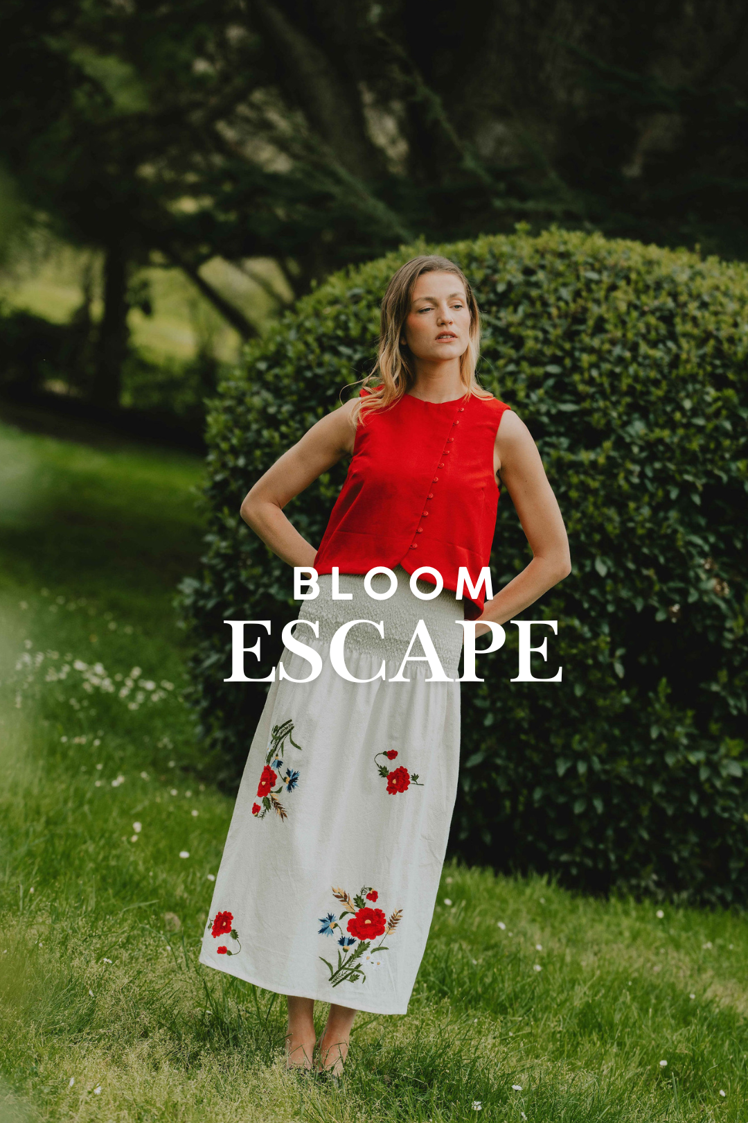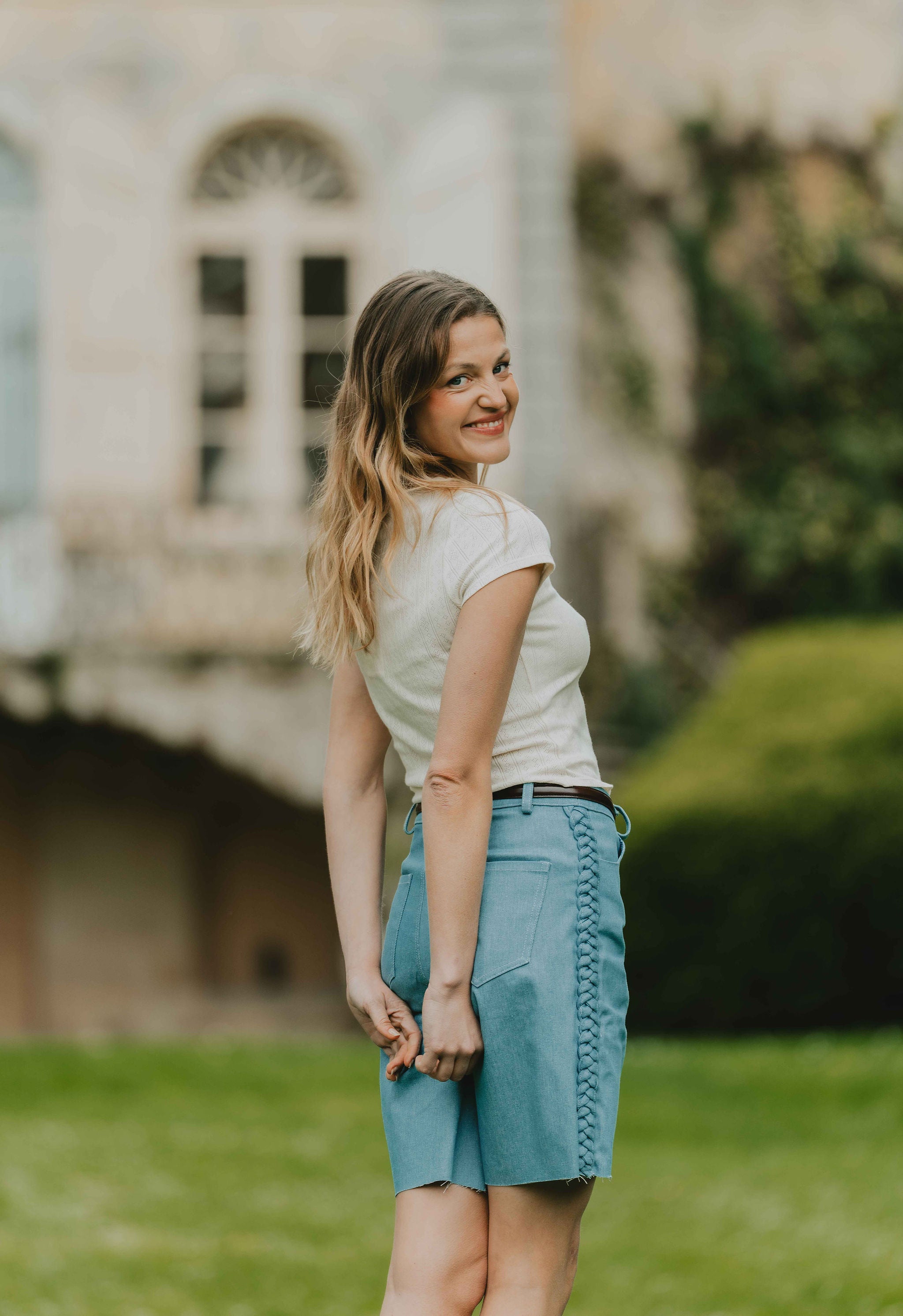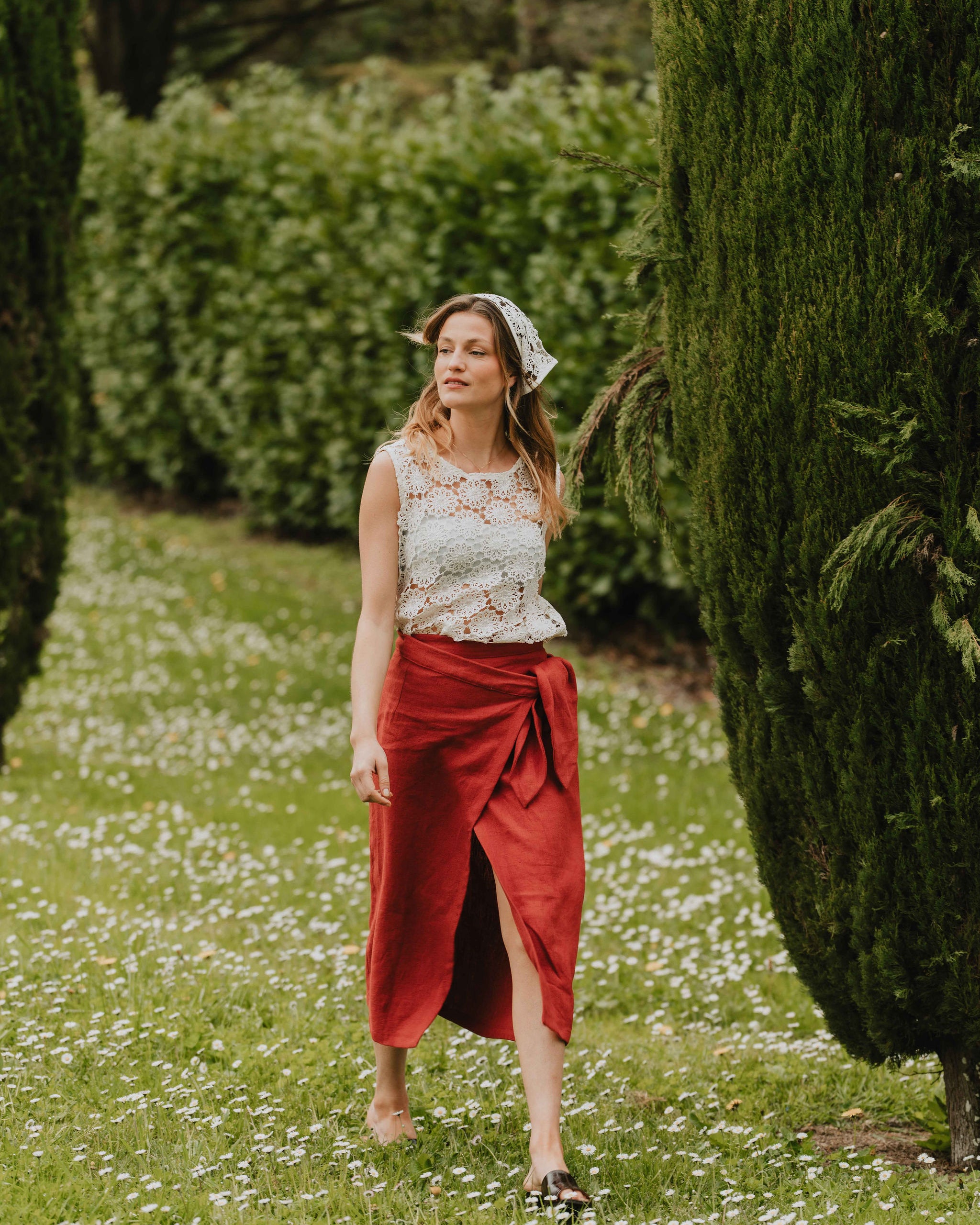 Elle se décline en chemisette à nouer ou à boutonner, ainsi qu'en jupe trapèze.