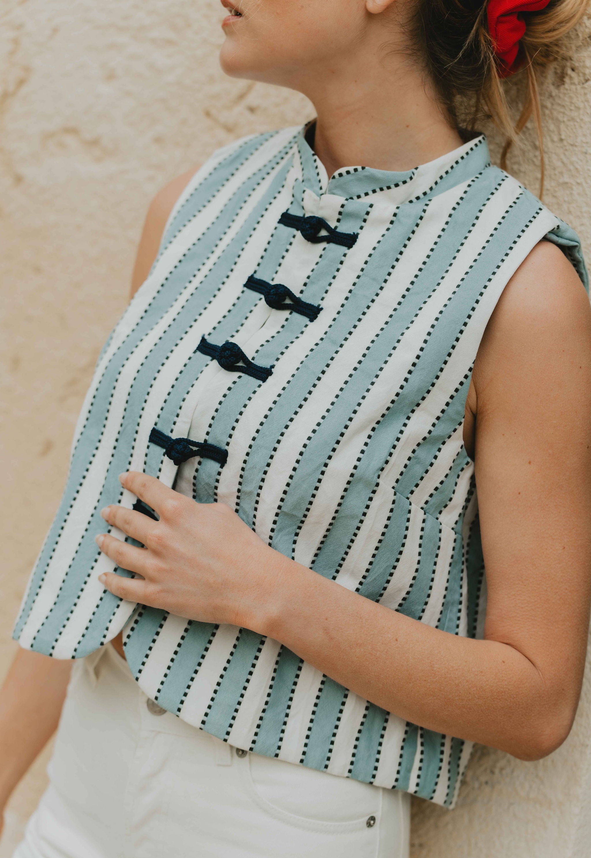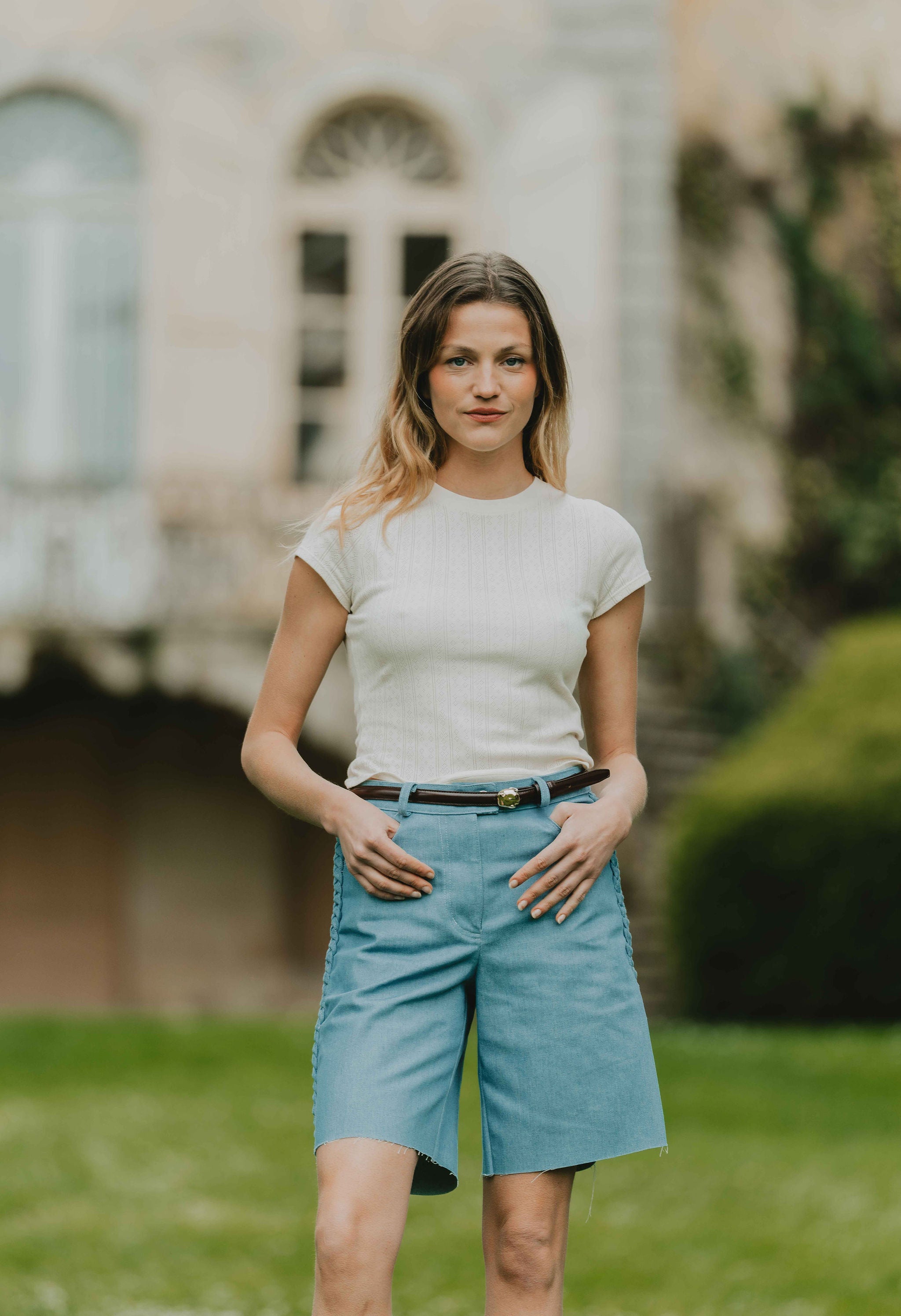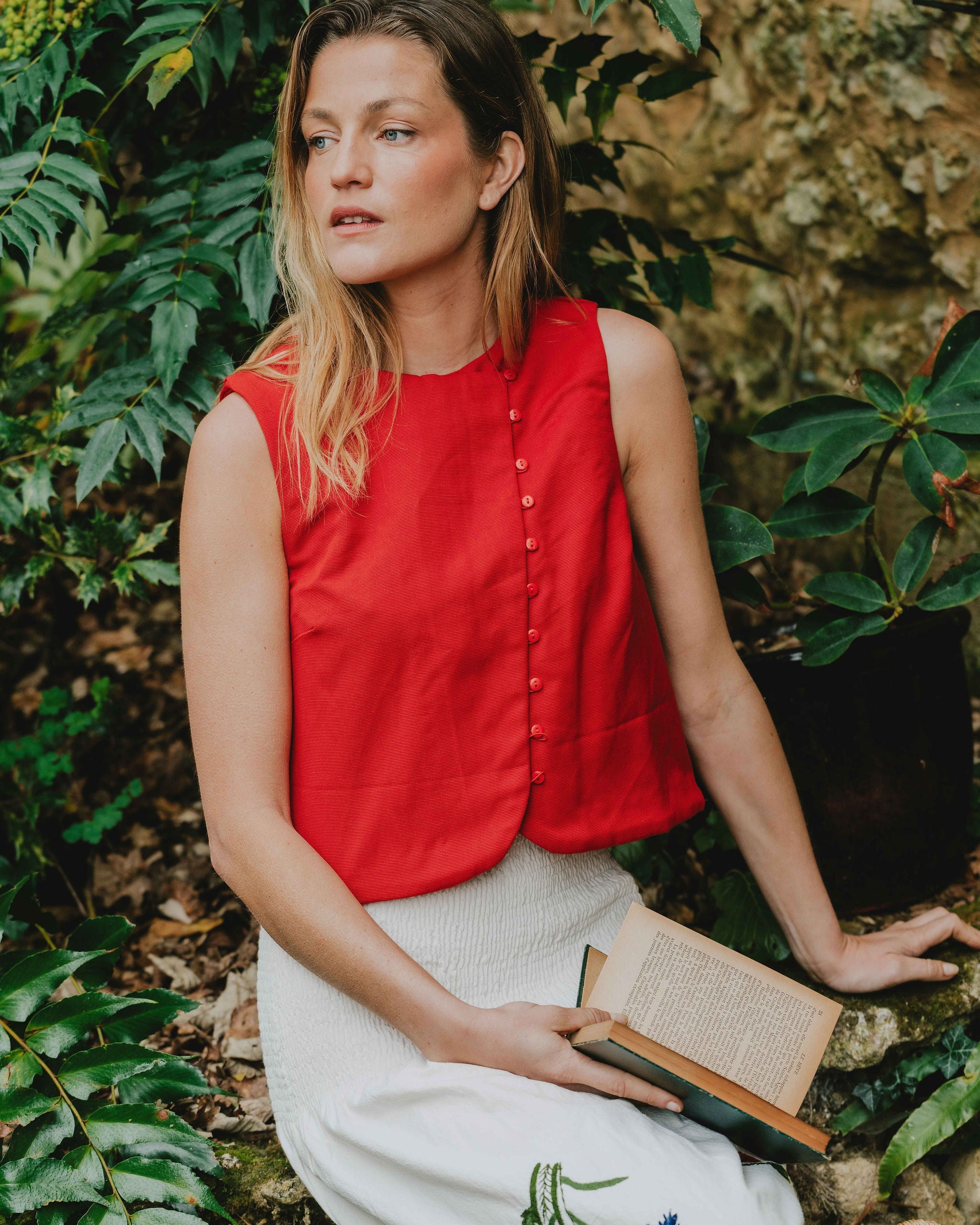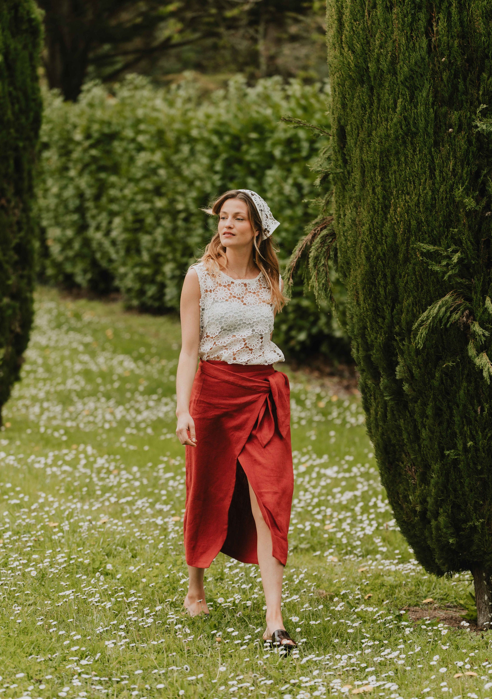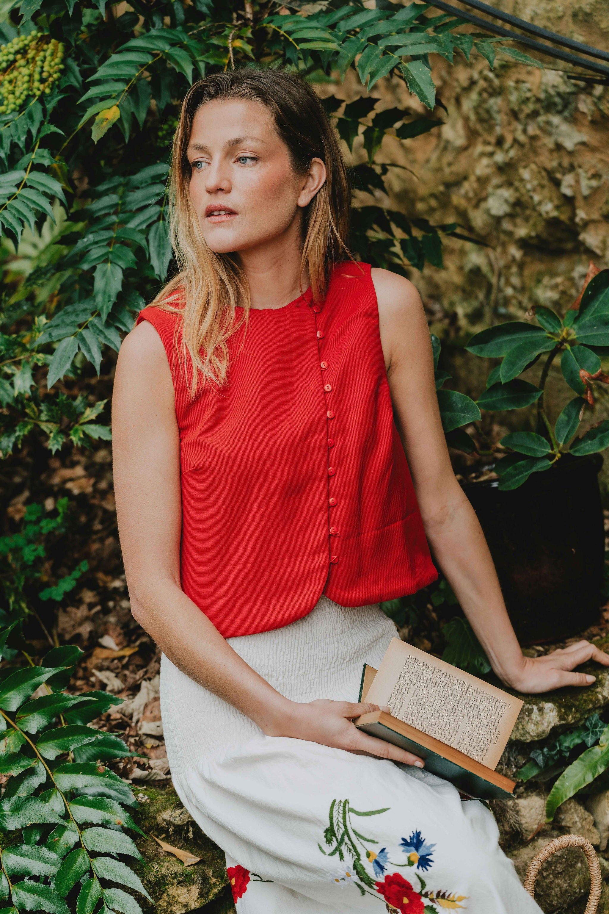 Elle se décline en chemisette à nouer ou à boutonner, ainsi qu'en jupe trapèze.