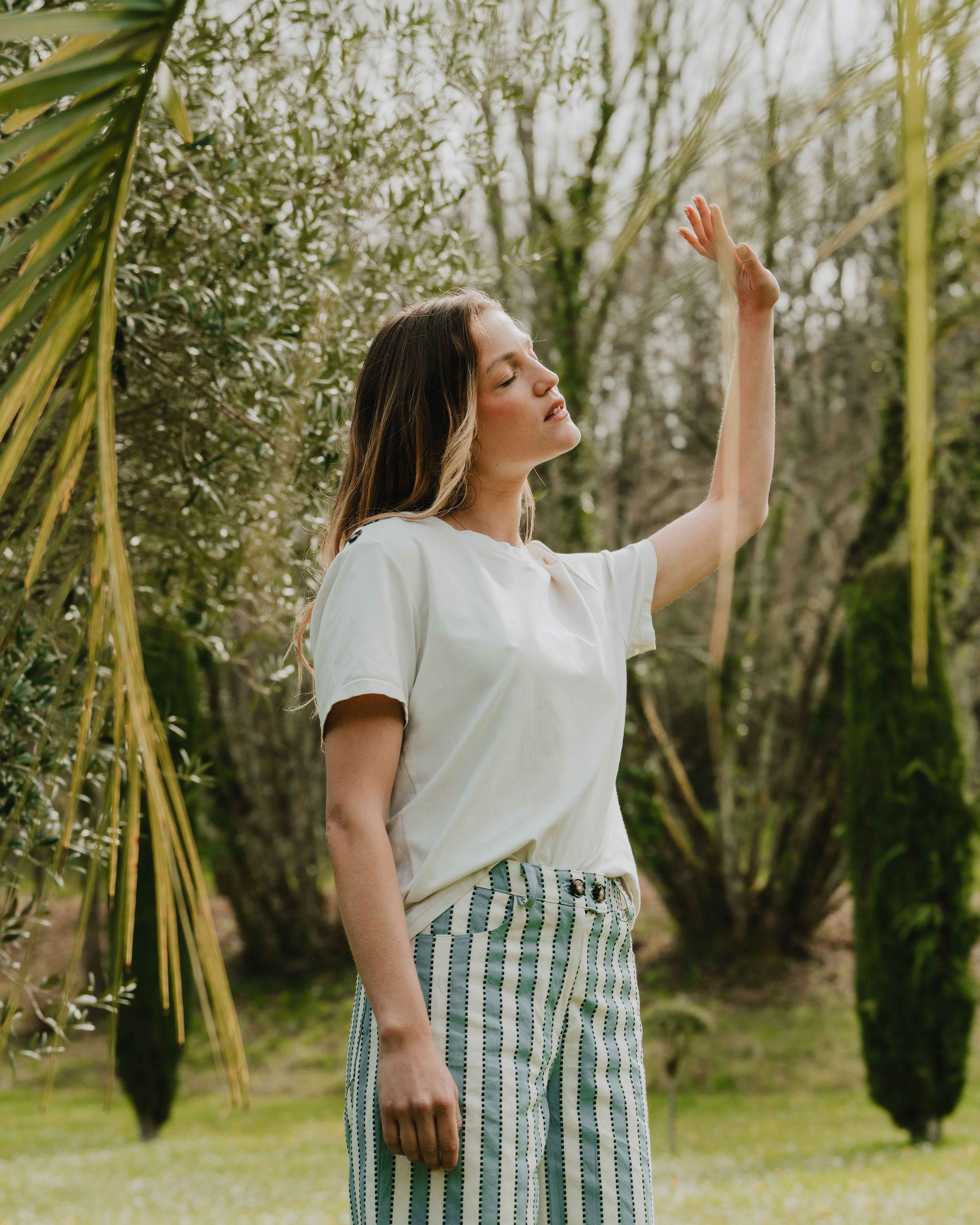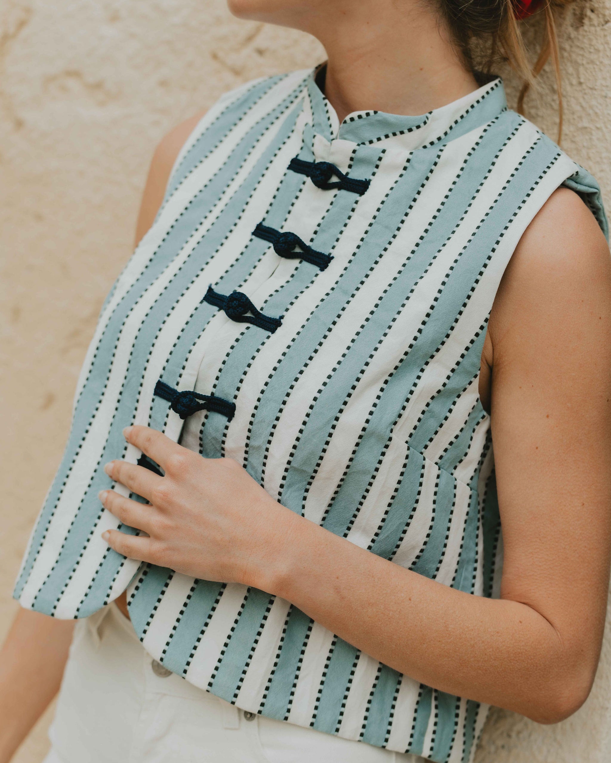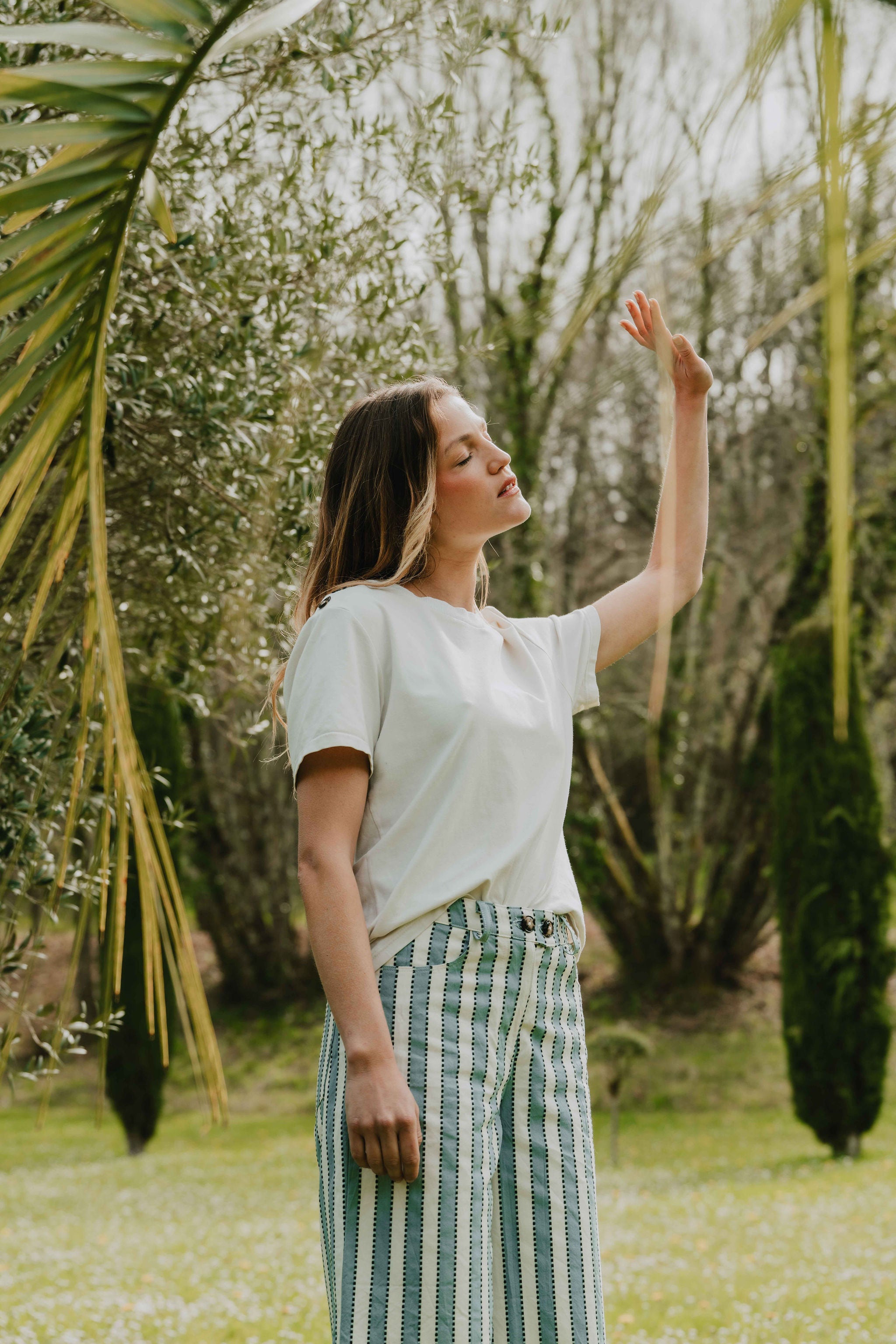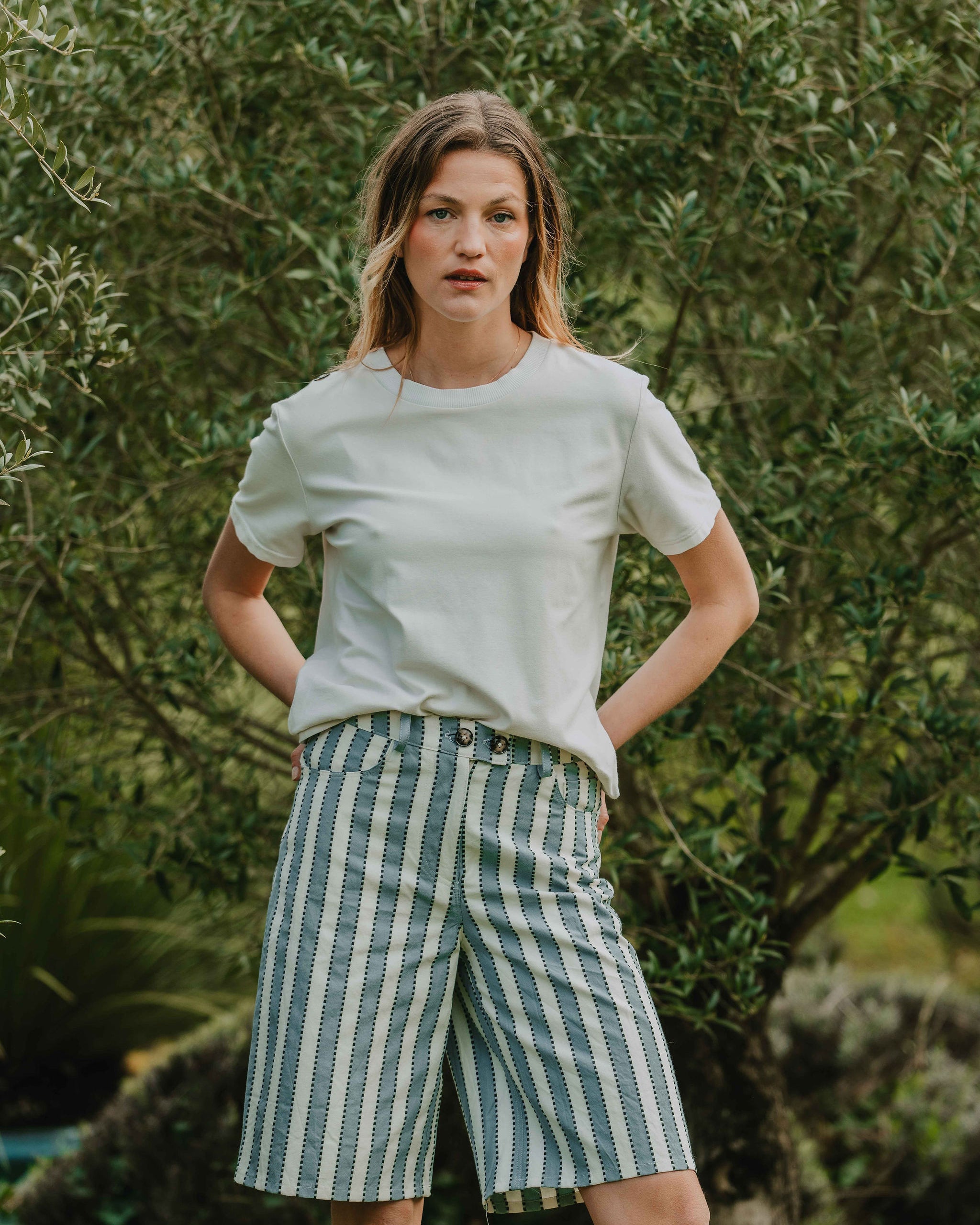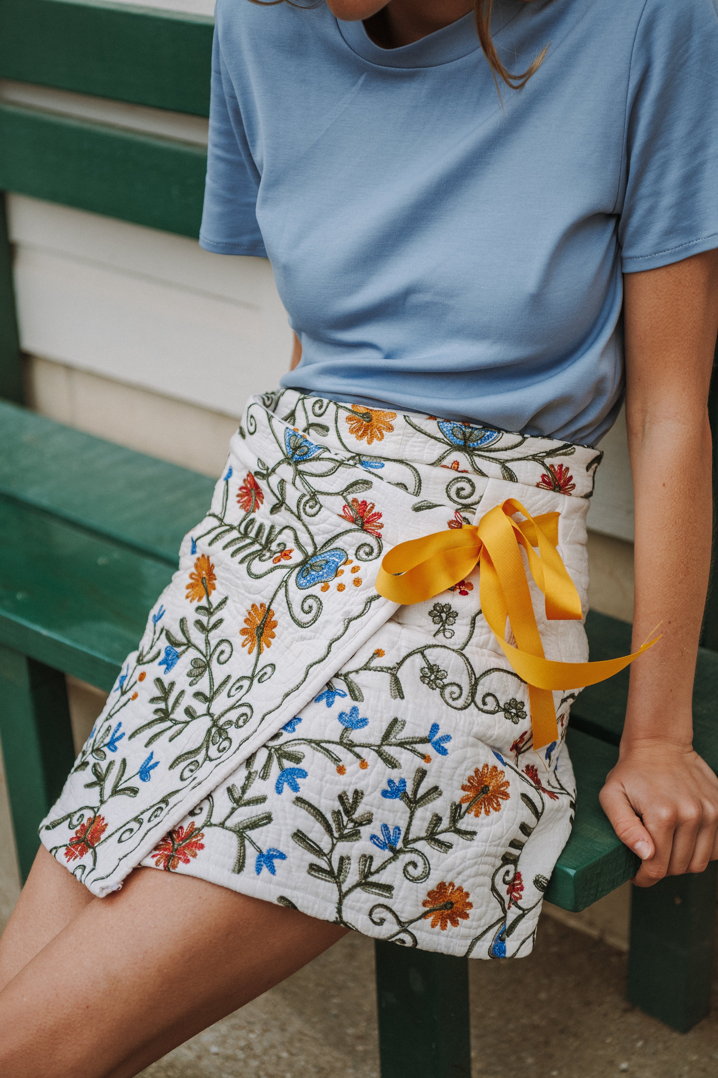 Elle se décline en chemisette à nouer ou à boutonner, ainsi qu'en jupe trapèze.