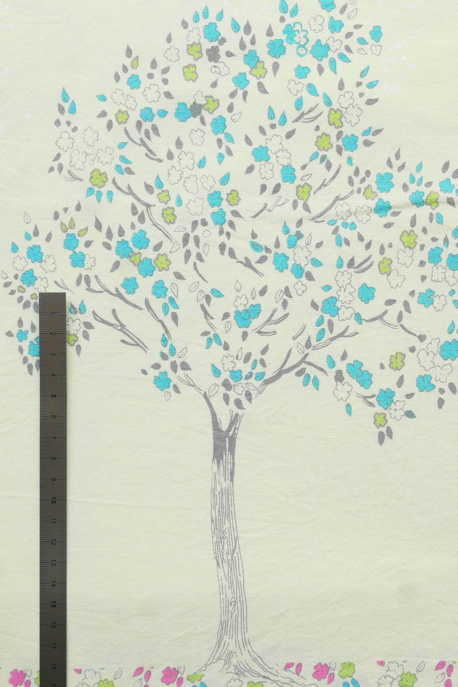 Tissu - Coton - Fond jaune avec des arbres fleuris aux teintes mauves et bleues - 210 cm * 214 cm