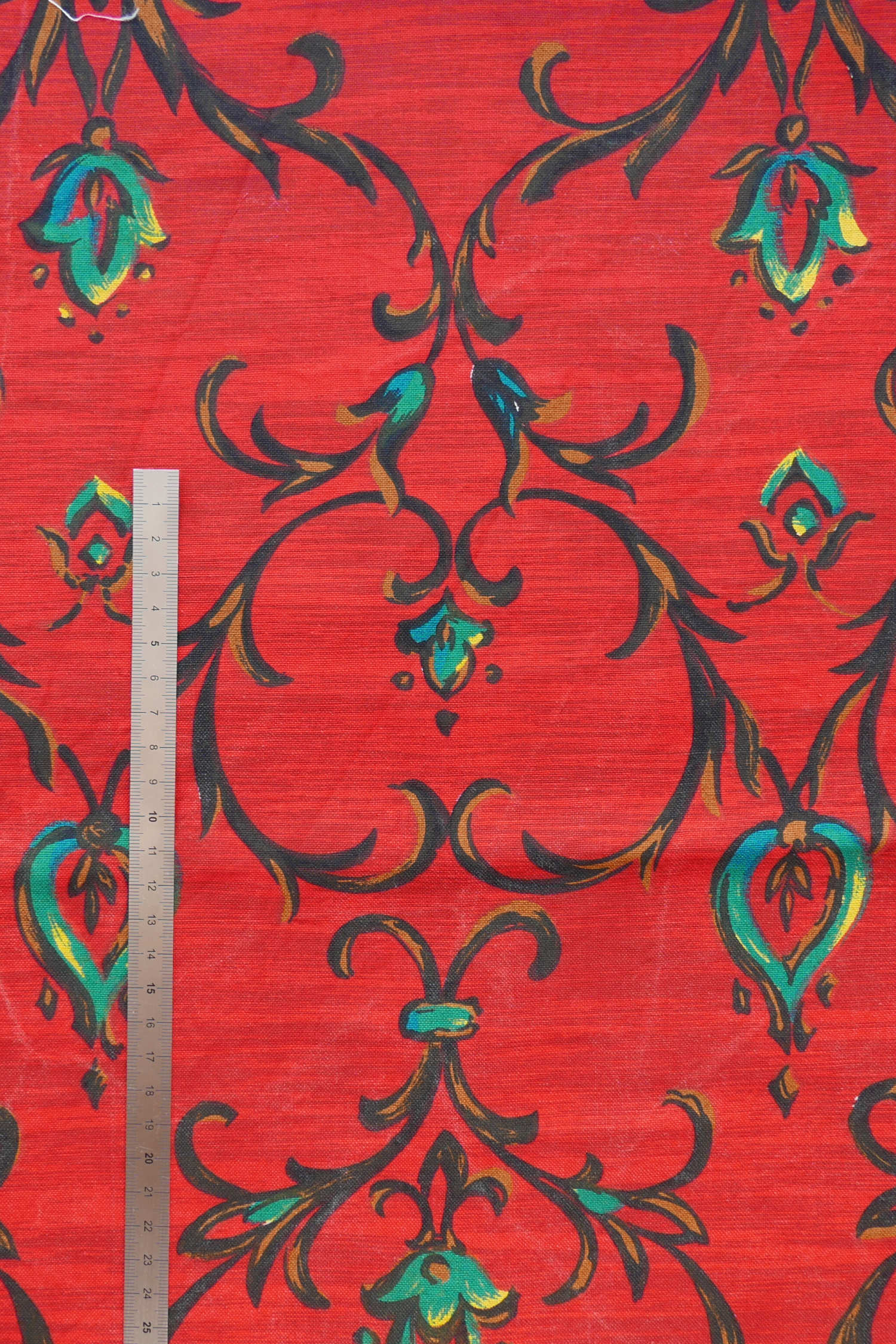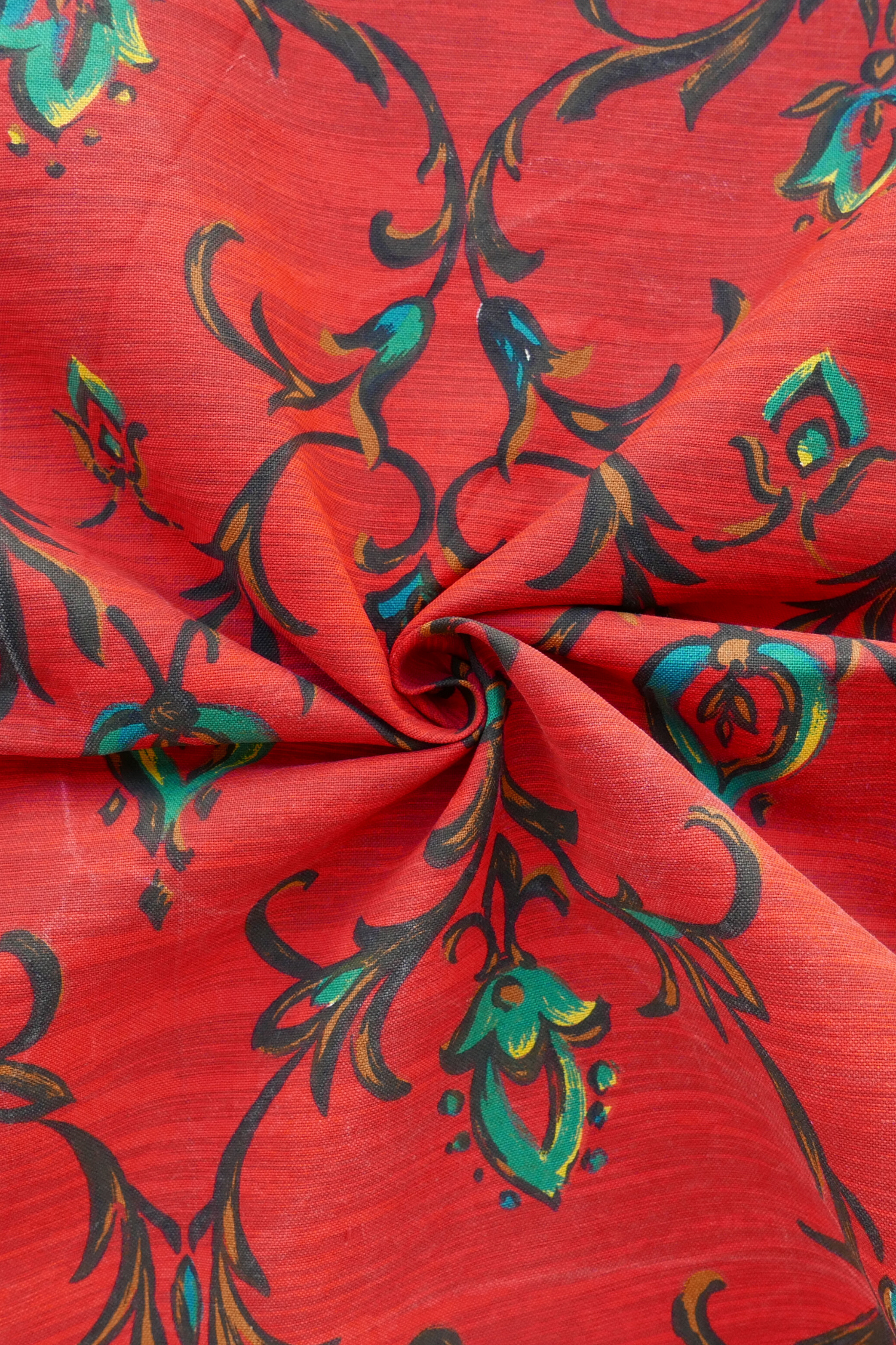 Tissu - Polyester - Fond rouge avec un motif floral aux teintes vertes et jaunes - 89 * 196 cm